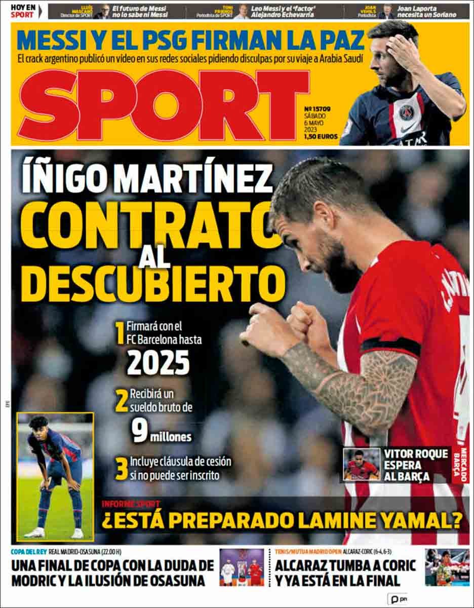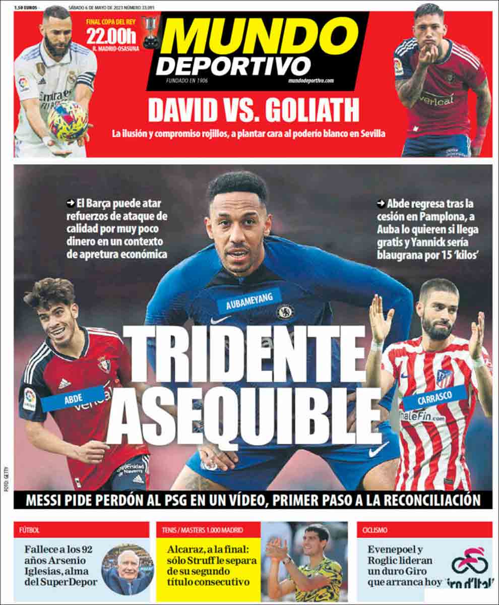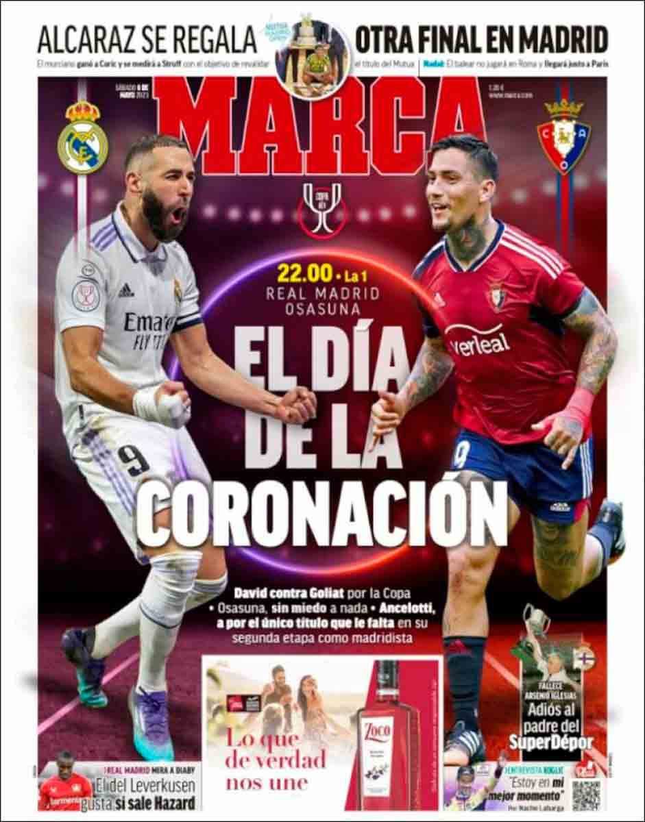 Las portadas se hacen eco de otras noticias, como la nueva final de Alcaraz en Madrid en su camino por coronarse como el nuevo rey de la tierra batida, o el fallecimiento de Arsenio Iglesias, o Bruxo de Arteixo, fugaz entrenador del Real Madrid. Descanse en paz. Desde aquí mandamos un fuerte abrazo a su familia. Como un fuerte abrazo enviamos a Gaby Deck, cuya grave lesión se menciona de soslayo en una esquina de As. Se perderá lo que queda de temporada, partidazo frente al Partizán incluido, y desde aquí deseamos una pronta recuperación al jugador argentino. Ojalá sus compañeros puedan regalarle la clasificación a la Final Four de Kaunas.