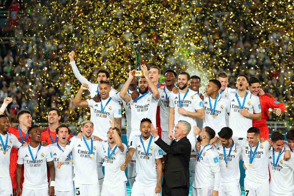 El sábado por la noche, en Rabat, Benzema levantó al cielo el título oficial número cien de la historia del Real Madrid Club de Fútbol, una historia que contará el próximo seis de marzo con ciento veintitrés años. Cien, cien copas, cien títulos. Cien, uno más que todos los nombres de Alá; cien, casi el doble de los que tiene la Associazione Calcio Milan, que durante años lució orgulloso por ahí aquello de club più titolato dell mondo. Cien, dos más, también, que su gran adversario en España y en el Mundo, el Fútbol Club Barcelona. Aunque es verdad que en la vida lo importante siempre es la calidad y no la cantidad, en esos cien entorchados hay treinta y cinco Ligas, catorce Copas de Europa y ocho Copas del Mundo de clubes. O sea, más de la mitad, casi el sesenta por ciento, son títulos patanegra, la crema de los títulos.