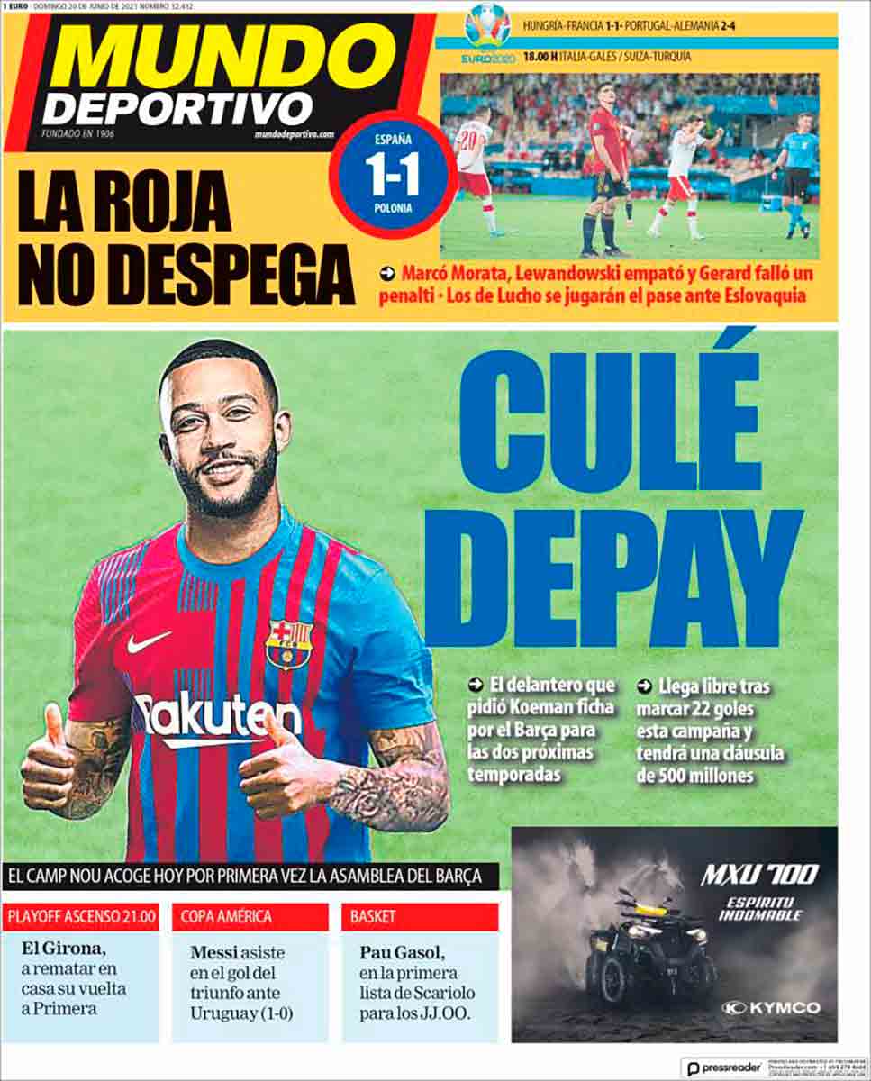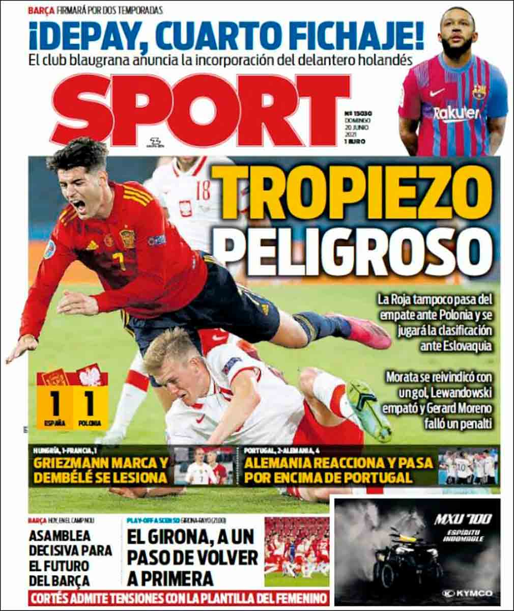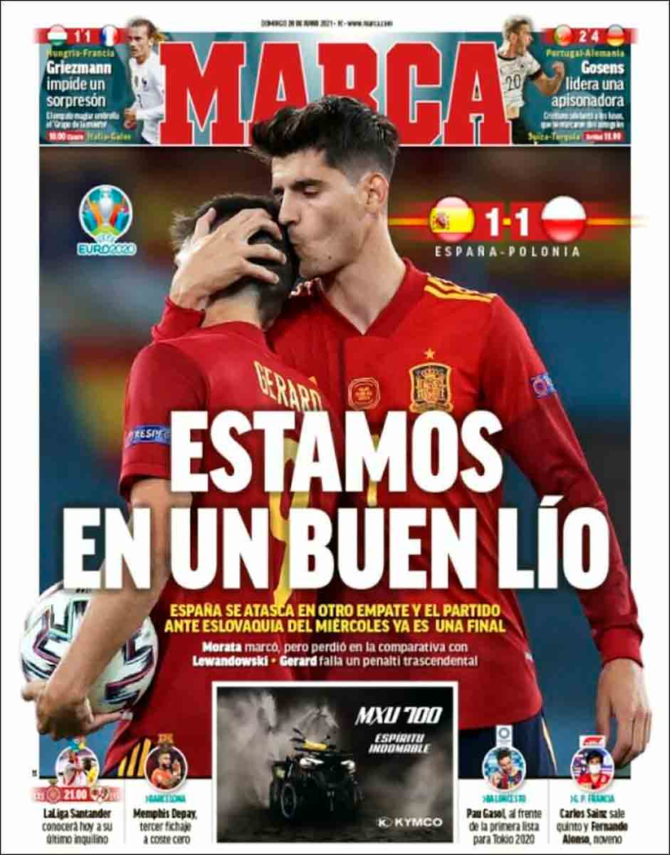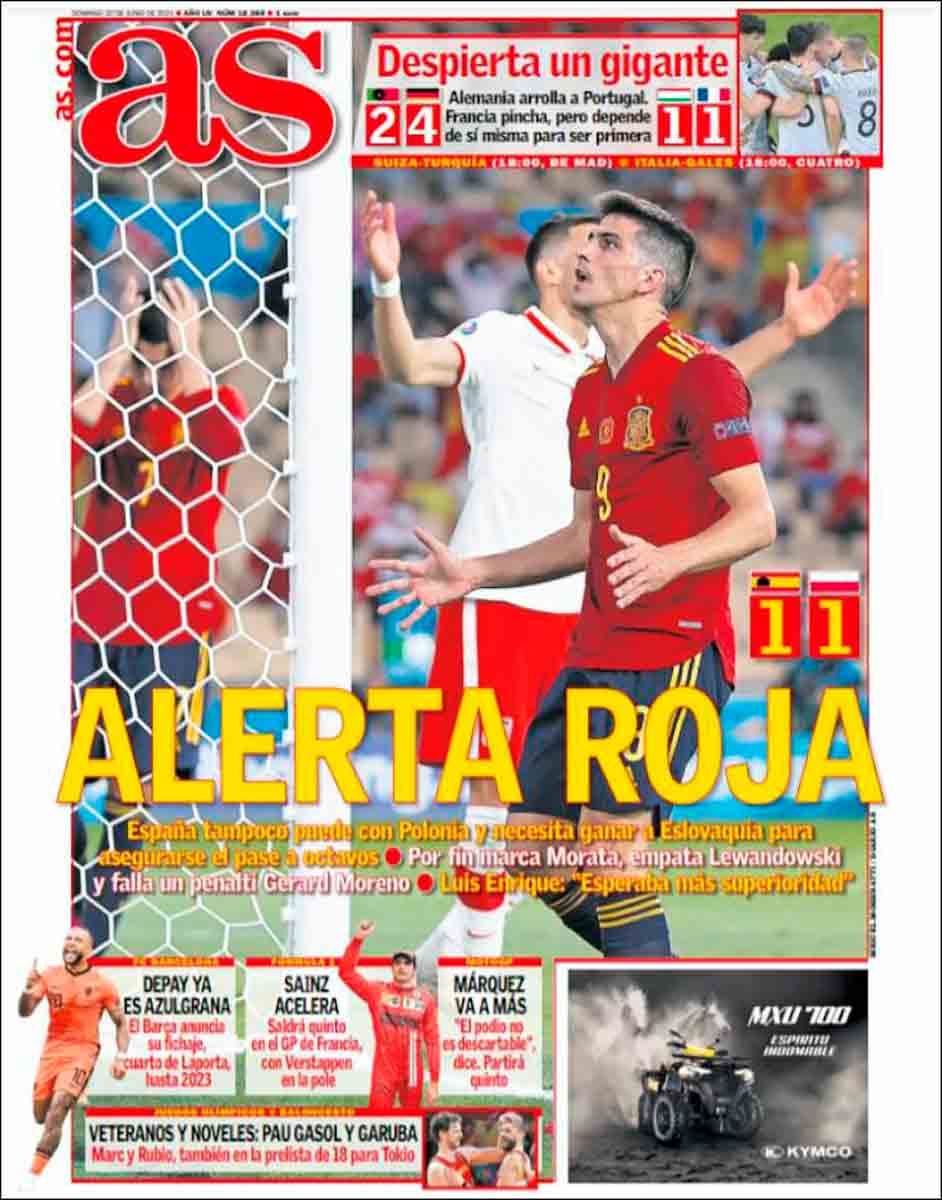 “Alerta roja”, que suena a película de sobremesa de domingo, a cine B de catástrofes o de wéstern con vaqueros y pieles rojas. Gerard Moreno parece entrar en una especie de trance como si fuera un hechicero indio frente a un tótem, aquí sustituido por el poste contra el que se estrelló su lanzamiento de penalti. Las portadas recogen también la exhibición de Alemania frente a Portugal y el pinchazo de Francia ante Hungría, y no podemos dejar de pensar en la diferencia de ritmo de unos equipos y otros con nuestra selección. Exactamente igual que en la Fórmula 1, de la que nos destacan el quinto puesto en la parrilla de salida para nuestro Carlos Sáinz.