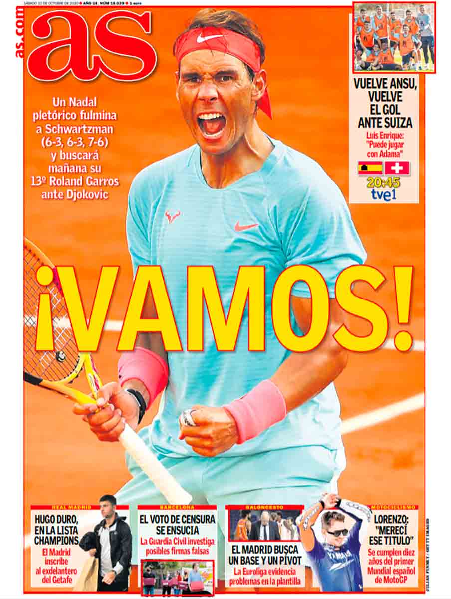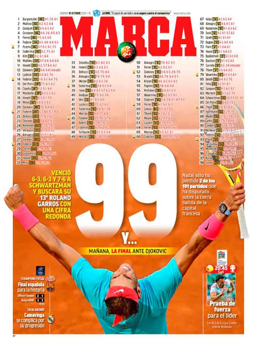 Nada importa ya lo que haga después de todo lo que hemos visto, pero él continúa. Así que claro que importa. Nadal es la fiesta que nos sigue y lo menos que podemos hacer es celebrarla como la celebra hoy ¡hasta As!, olvidándose excepcionalmente de la puya de rigor al Madrid. O casi. Puestos a destacar algo distinto, señalar con ilusión que el romance entre Koeman y Pedri continúa entre declaraciones de amor sin tapujos. "Me encanta Pedri", dicen que dice Ronald en Mundo Deportivo. Call me by your name, Ronnie. Así que viva el amor. Pero hoy que viva sobre todo Rafael Nadal, que para nosotros (esa Décimotercera era el destino listo para superarse) es el mejor de los mejores por encima de sus rivales de siempre.