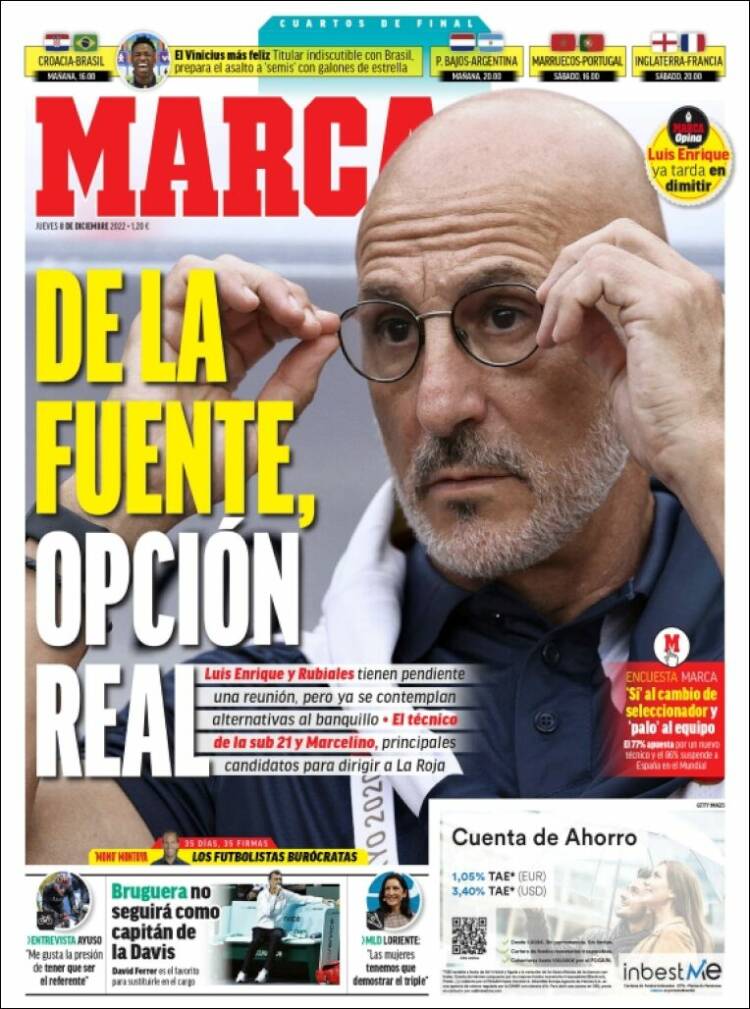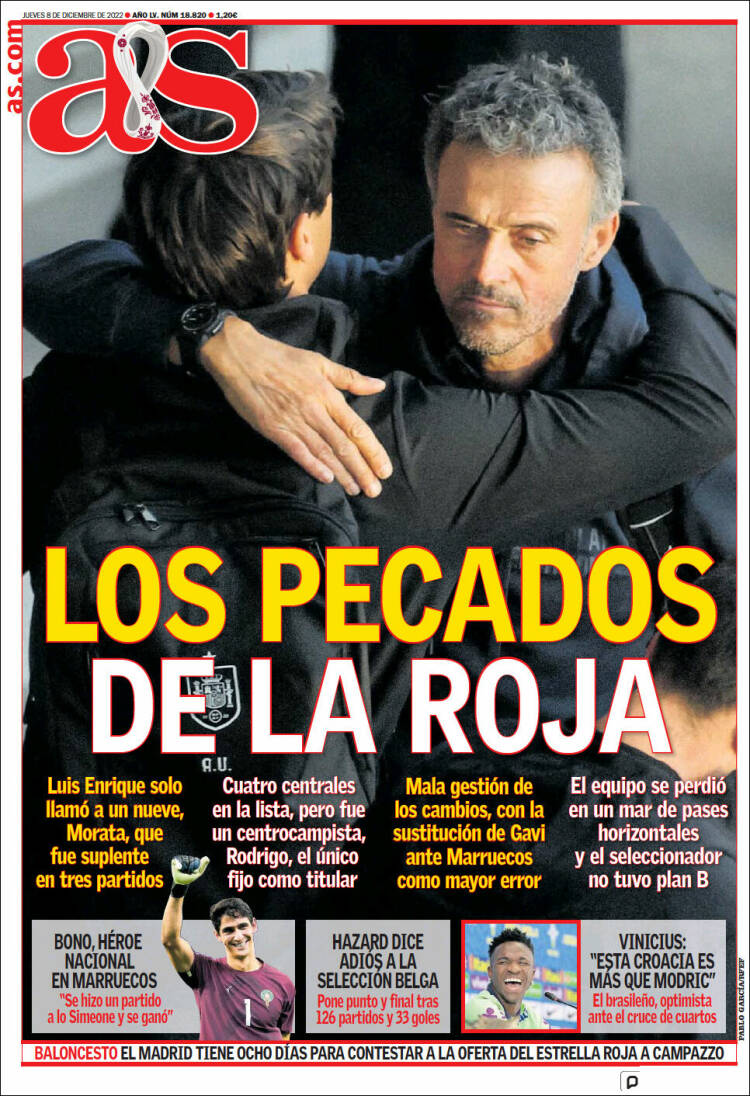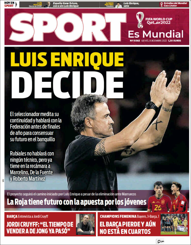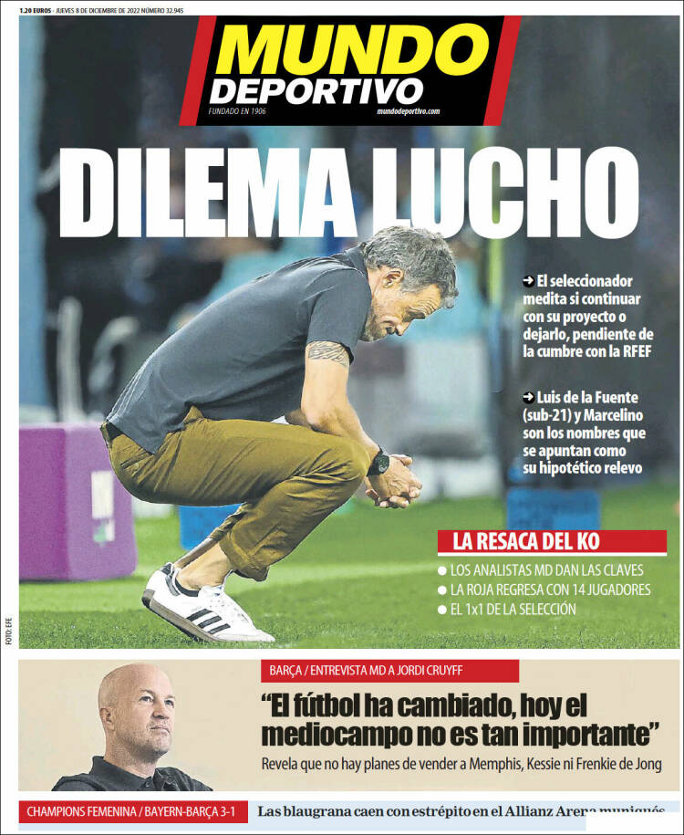 De todos modos, lo que de verdad nos pirra de la primera plana de Sport es el faldoncillo optimista sobre los jóvenes. “La Roja tiene futuro en su apuesta por los jóvenes”. Así, como dogma de fe. Habréis de procesarlo como verdad revelada, hermanos. Acaban de pegarse el costalazo del siglo en Catar, pero “la Roja tiene futuro”, junto a una foto de los manidísimos Pedri y Gavi, que solo están en las fotos de lo promisorio o en las que tratan de salvar los restos del naufragio. Nunca en las fotos de la responsabilidad. Flaquísimo favor el que se le hace a la formación de estos dos juguetes rotos, estos dos árboles arrancados de cuajo antes de brotar en el artificio de que eran los nuevos Xavi y Pedri. De momento, todas las evidencias van en sentido contrario, pero “la Roja tiene futuro” ha de continuar como mantra. Recítese en lo oscuro, como la letanía de un rosario interminable y lacerante.