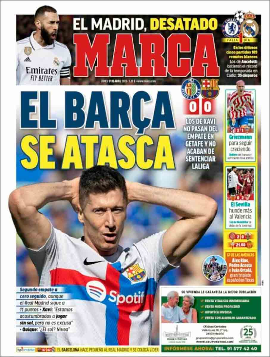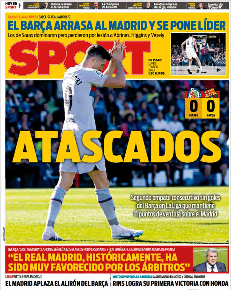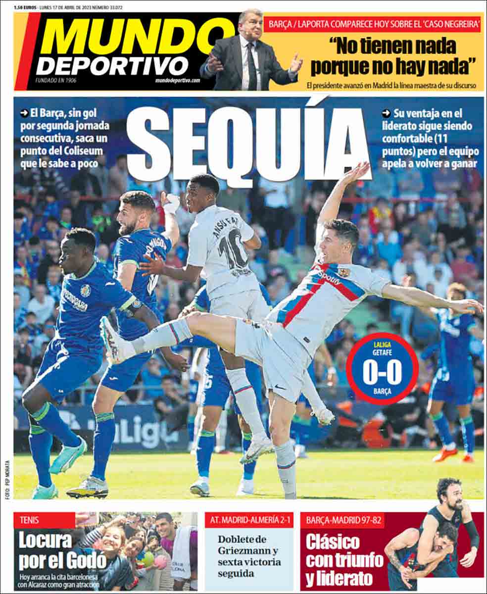 Las portadas del día se inclinan más bien por resaltar el frenazo deportivo del Barça cuando ya tiene la liga más que a tiro (empató a cero en el campo del Getafe, frente a una multitud colérica ante las tropelías corruptas del club blaugrana), pero también comentan, especialmente Sport, el adelanto de la rueda de prensa de hoy que ayer ofreció Laporta durante un acto con las peñas madrileñas culés. El sujeto se permitió criticar al Madrid por personarse en la causa del asunto BarçaGate (si le parece a Laporta, el Madrid se queda de brazos cruzados ante la evidencia de que le tangaron liga tras liga durante casi dos décadas), y se permitió, en el colmo del desahogo, cuando pende sobre su cabeza el pronunciamiento de la Fiscalía según el cual el Barça pagó al número dos de los colegiados para asegurarse arbitrajes favorables (“neutralidad” según el eufemismo usado por el propio Negreira ante Hacienda), se permitió, decimos, hablar de un presunto favoritismo histórico de los trencillas con el Madrid. Su desfachatez es infinita.