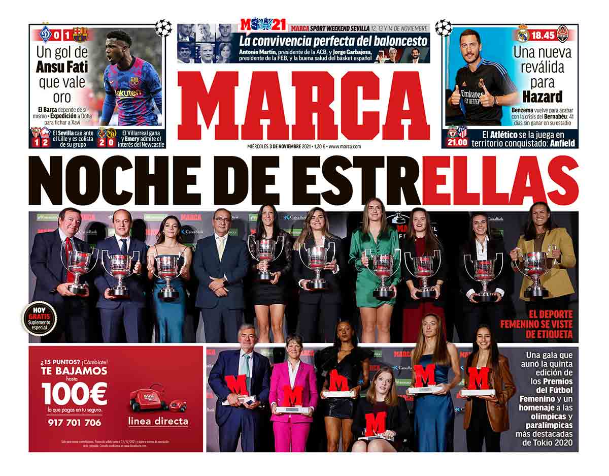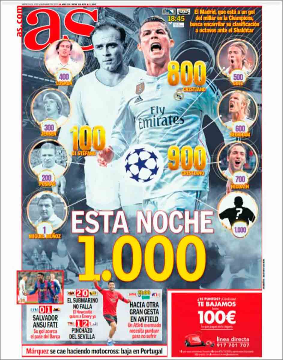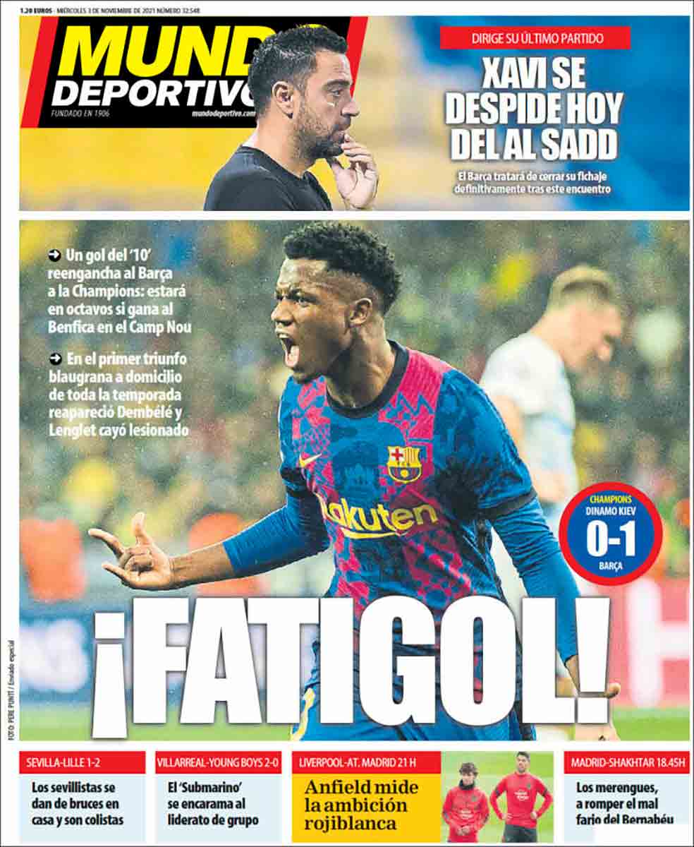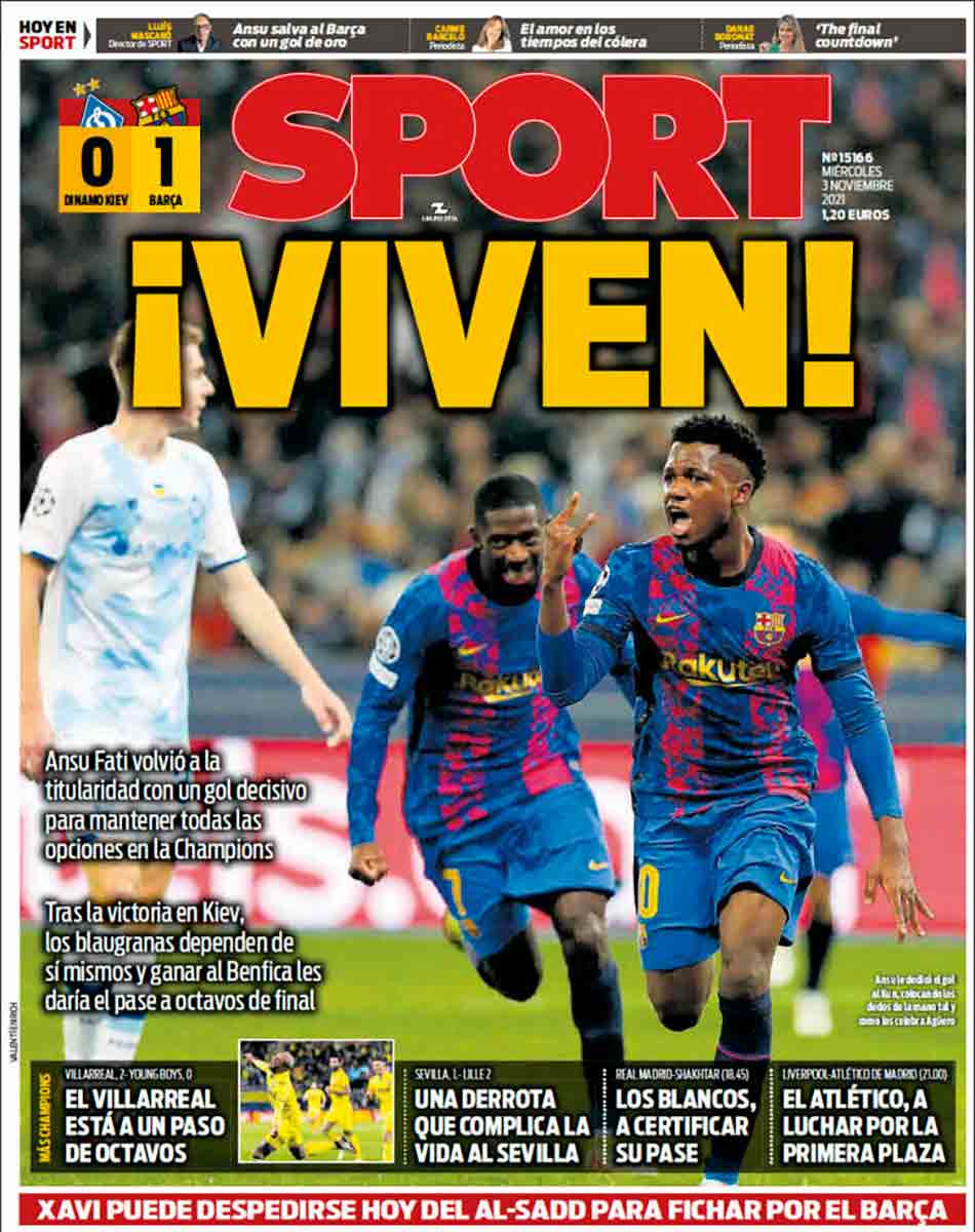 Sí, hoy también hay prensa escrita y primeras planas. Las portadas cataculés celebran el triunfo del Barça en Kiev, omitiendo por supuesto cualquier posible mención a dos penaltis (Busquets y Eric) bastante de libro en área blaugrana; As se centra en el partido de esta tarde (no lo olvidéis: 18:45 en el Bernabéu ante el Shakhtar, con el Madrid pendiente de marcar su gol número 1.000 en la competición fetiche); Marca da pábulo a su loable gala del deporte femenino.