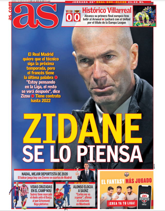 As suelta sin anestesia la incógnita que todos llevamos encima desde mucho antes de que el Chelsea nos fulminara en nuestra competición fetiche. ¿Seguirá Zidane? Parece ser única y exclusivamente su decisión personal. Como bien indica As, Zizou viene dando largas en cuanto a la respuesta. Si da largas, todo hace indicar que tiene una duda seria sobre su continuidad. Si no la tuviera, ya habría dicho que sigue a fin de aplanar las aguas soliviantadas.