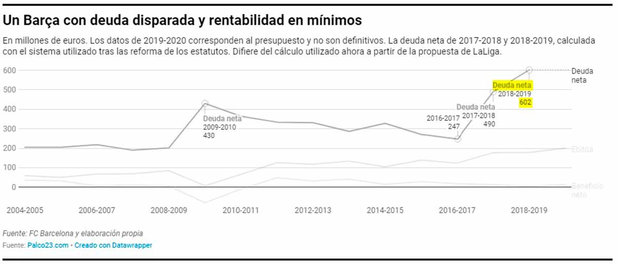 Entonces, la Deuda Neta del club llegaba a los 430M de Euros. Algo inaudito en el fútbol. Sobre todo, teniendo en cuenta sus ingresos aquella época, sobre los 450M anuales.