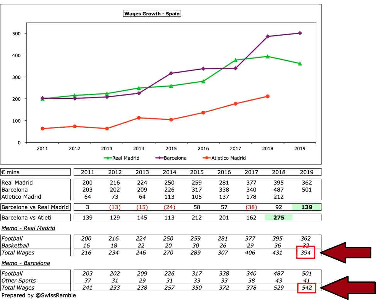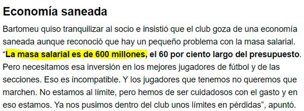 El propio Bartomeu reconocía hace un año - antes de saber nada del COVID -, en una entrevista para BarçaTV, que el gasto salarial de la temporada pasada era de 600M de Euros. Es decir, se mantenía la diferencia de 150M de Euros más anuales, sólo para pagar a sus jugadores, con respecto al Real Madrid.