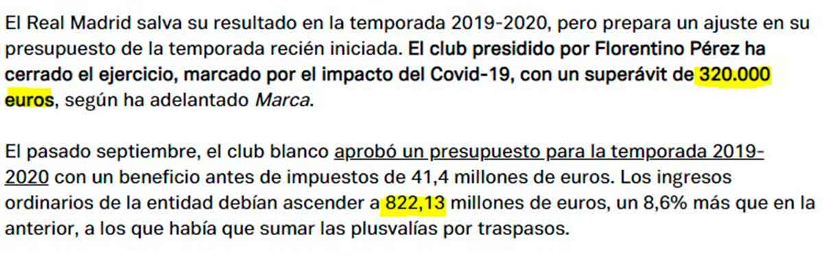 A diferencia del Barcelona que previó unos beneficios de 4M de Euros para la temporada pasada sin existir el COVID, el Real Madrid tenía previsto ingresar 41M de Euros de beneficios (gastar 41M menos de lo que pensaba ingresar) con unos ingresos de 822M.