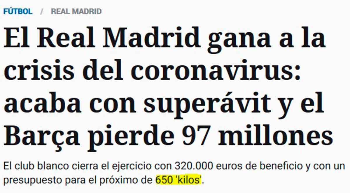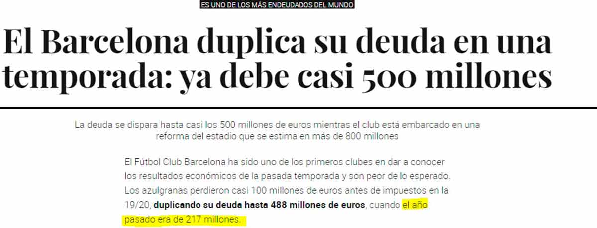 Ahora con todo lo que sabemos, podemos leer la noticia bomba (aunque no mucho, en Marca ni lo han nombrado) de que debido a la crisis económica del COVID, la Deuda Neta del Barcelona sube a ¡488M de Euros! Una cifra escandalosa, sin duda.