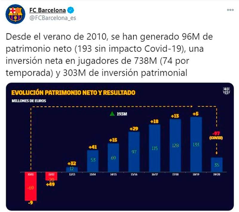 El club acaba de reconocer en su cuenta oficial de Twitter que, además aumentar su deuda en 250M de Euros en el último curso, ha tenido un déficit de 97M de Euros esta temporada (o sea, ha gastado 97M más de lo que ha ingresado). Y eso que salvó parte gracias a vender a Arthur antes del 30 de junio, incluyendo esos 72M de su venta como ingresos de la temporada pasada (mientras que los 60M de gasto por la compra de Pjanic, empiezan a contar en la presente). Pese a la treta contable, los datos son históricos, lo que ha provocado que su Patrimonio Neto se haya reducido en esa misma cifra.