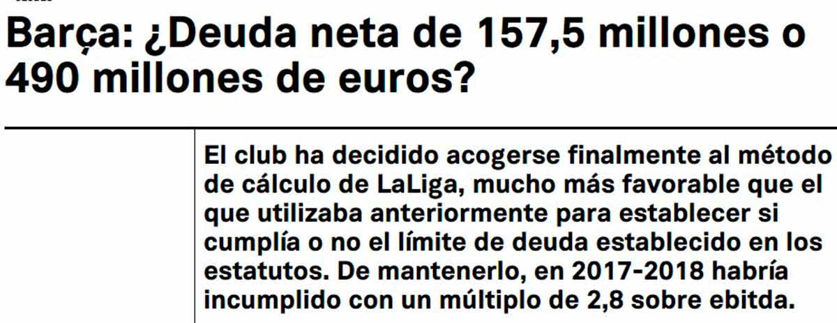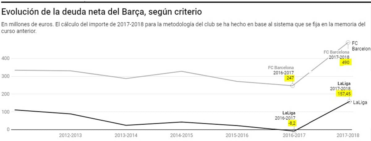 La diferencia de criterio es tan grande que cuando la Deuda Neta REAL del FC Barcelona era de 490M de Euros, para La Liga era de 157.5M. Cuando la Deuda Neta REAL era de "sólo" 247M, para La Liga era ¡hasta negativa! De -8.2M ¡Un chollo!