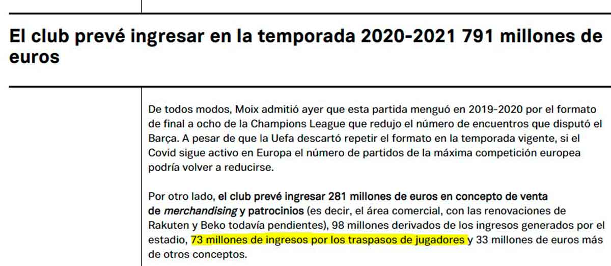 Pero, en el informe presentado esta semana, ha reconocido que ha terminado la temporada pasada con 760M de ingresos. Y prevé para la próxima 718M de Euros de ingresos. En realidad, dice 791 pero como repito, hay que restar los ingresos por traspasos porque el Barcelona es el único club de Europa que cuenta siempre ese concepto en sus ingresos, en vez de poner únicamente los ordinarios.