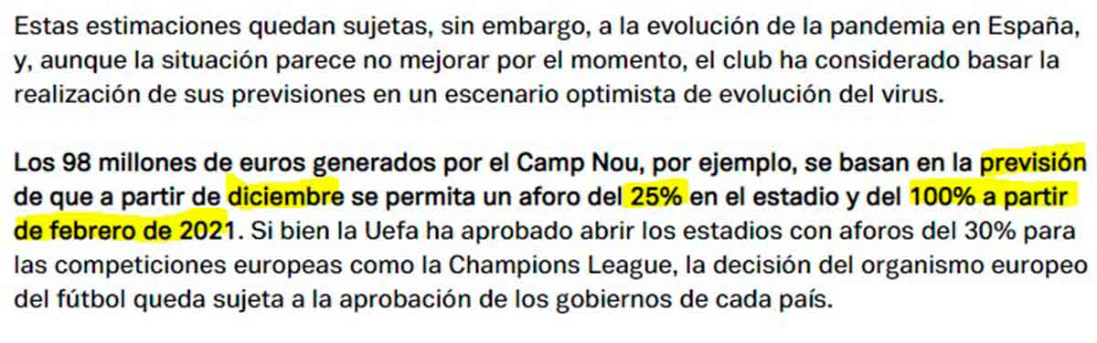Pero es que, además, esa estimación de 718M se basa en un supuesto que predice que se permita un aforo del 25% del estadio ya en diciembre y el 100% desde febrero. Unas estimaciones, me parece, bastante optimistas.