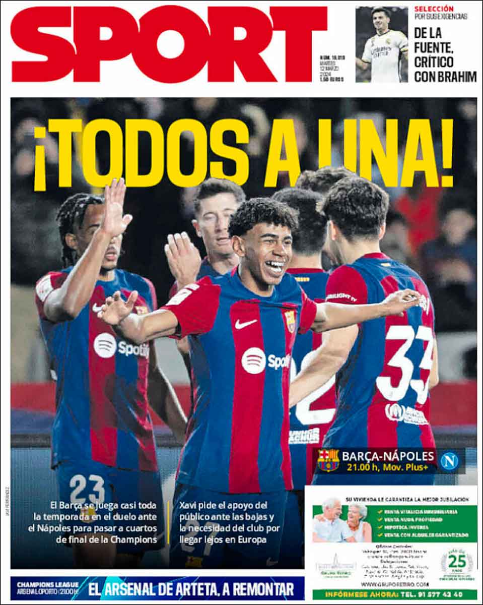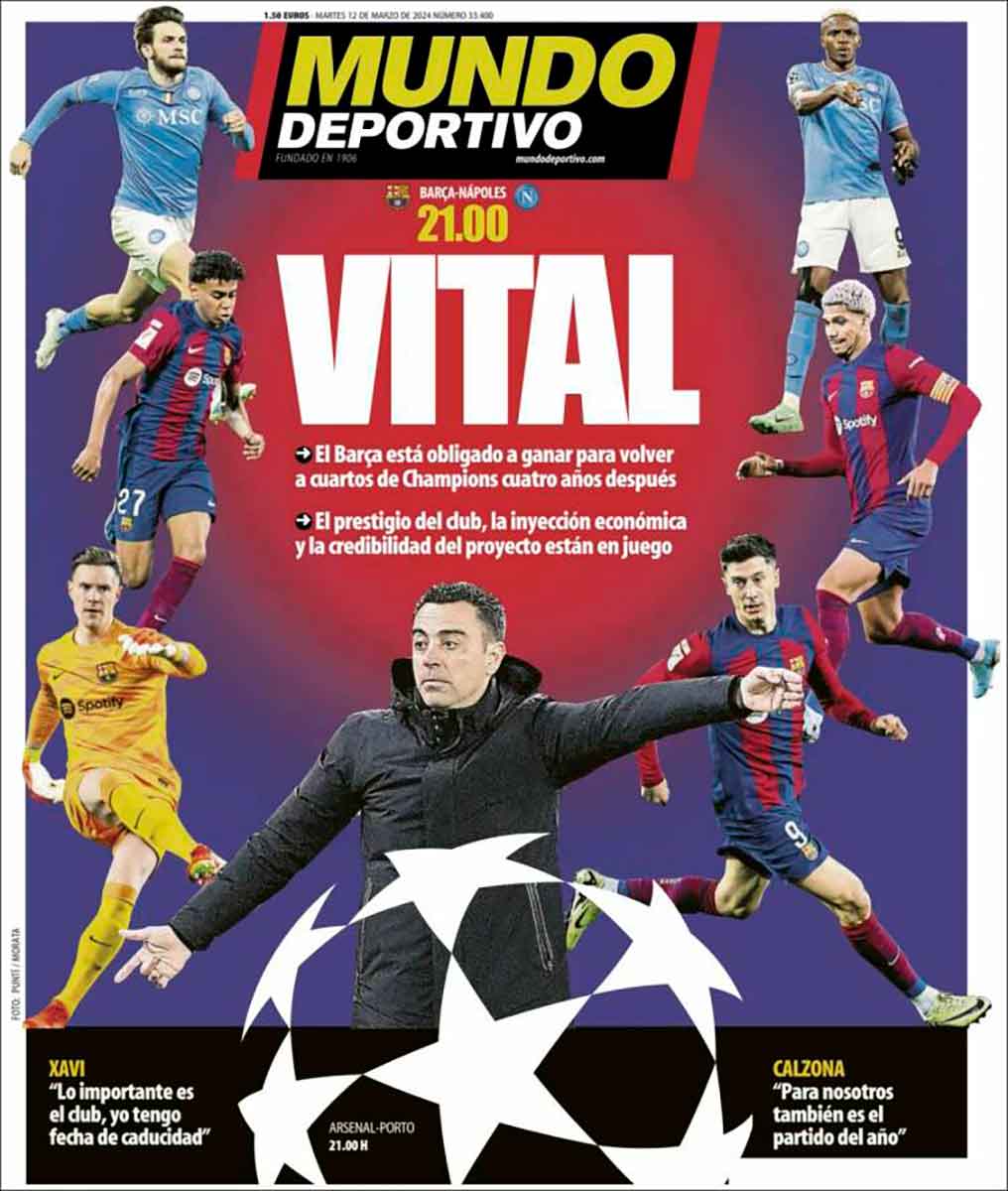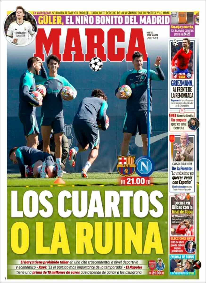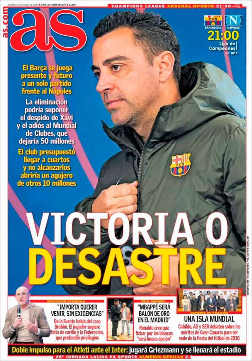Tanto Marca como As titulan también con disyuntivas, aunque con opciones no tan felices como la noche de ayer. «Los cuartos o la ruina» es el titular marquista, en referencia, claro a está, al Barcelona, que se juega hoy continuar en la Champions. Hay un pequeño problema, y ese pequeño problema es que el Barça ya está en la ruina, con independencia de que este año caiga eliminado antes o después en la máxima competición.