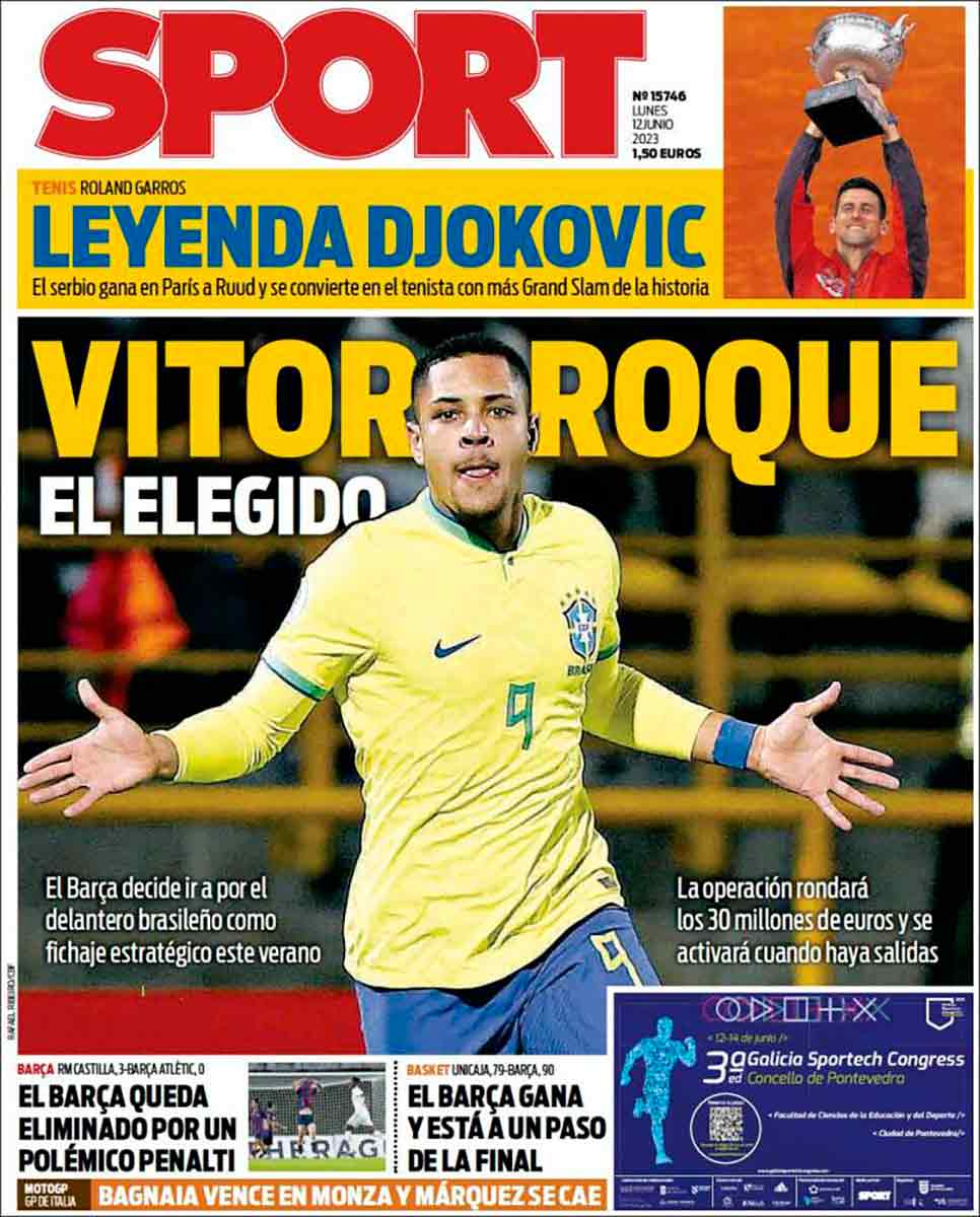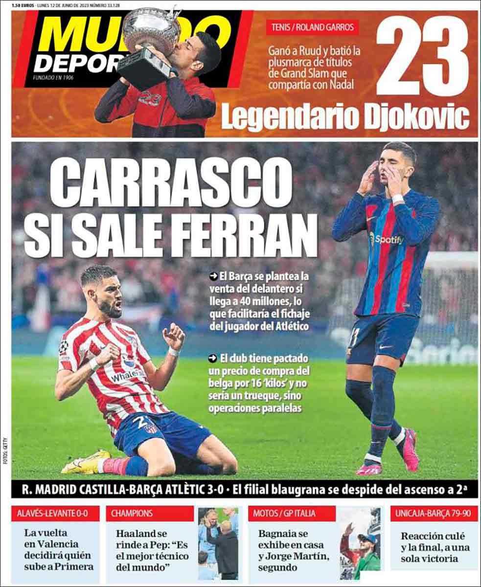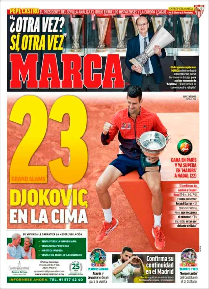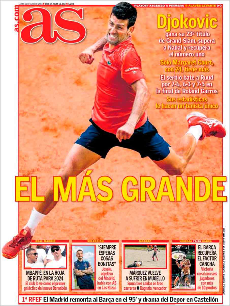 Tanto As como Marca entregan al Roland Garros de Djokovic los honores de sus portadas. Quiénes somos nosotros para negar la pertinencia de esto, habiendo alcanzado el tenista serbio la gloria de los 23 Grand Slam. Simplemente, nos gustaría que la gesta del Castilla hubiera tenido más espacio. Está por ahí abajo, casi imperceptible en el faldoncillo. Al menos Marca recoge la otra gran noticia blanca de la jornada de ayer: la confirmación por parte de Nacho Fernández de que renovará su contrato con el Real Madrid. Es lo mejor que podía ocurrir. Nacho, con sus 5 Champions Leagues a las espaldas, es un emblema del club y un defensa excepcional que hace vestuario, algo que parece esencial no perder cuando ya hemos perdido un líder como Karim y rumores no infundados apuntan a que podríamos perder algún peso pesado más. El liderazgo moral es un activo valiosísimo, y Nacho lo tiene en cantidades industriales, aparte de sus dotes futbolísticas específicas.