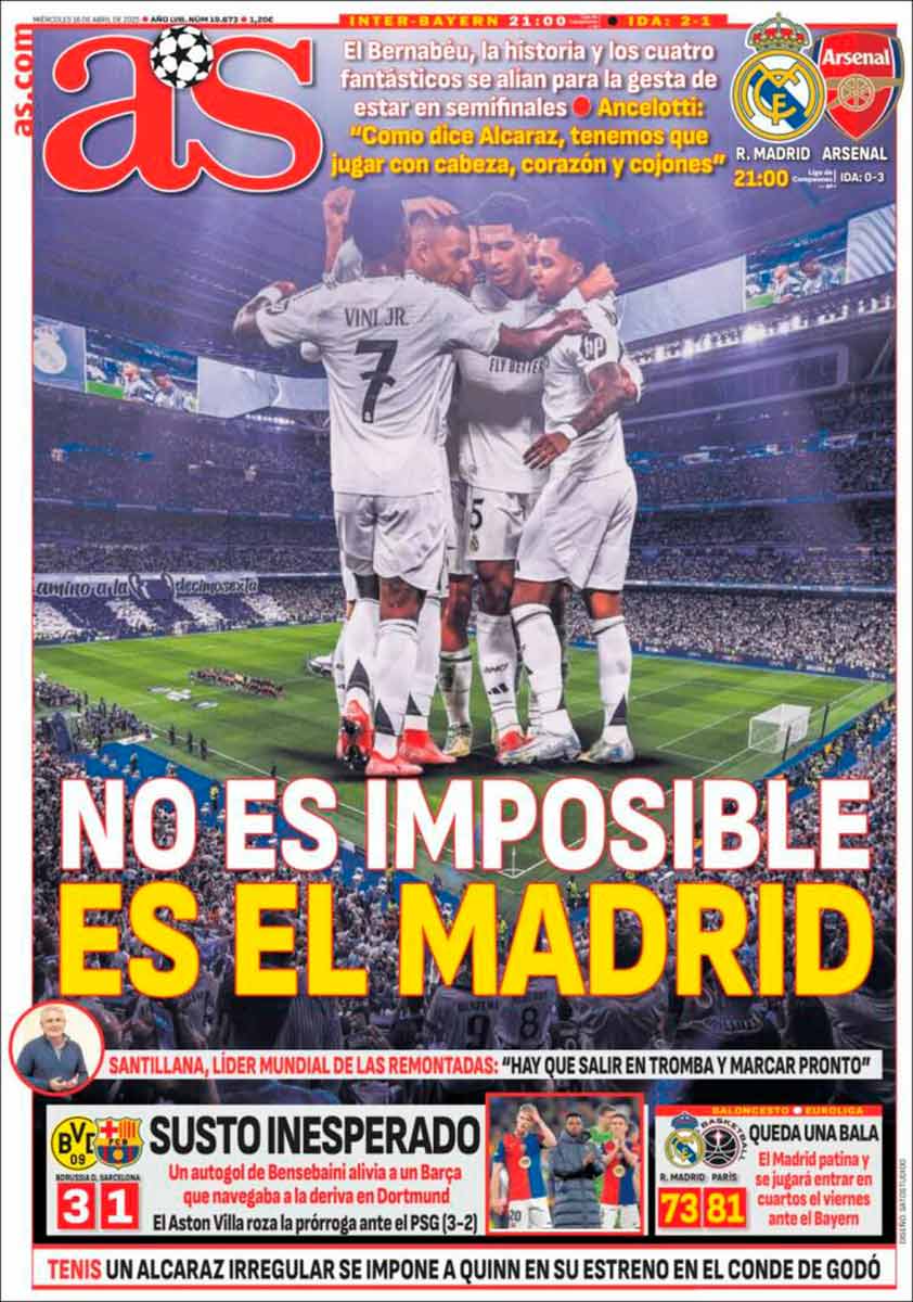“No es imposible, es el Madrid”, reza la portada de As. La frase sirve para hoy como sirvió el 11 de diciembre de 1985, cuando dos goles de Valdano y dos de Santillana obraron el milagro de remontar un ¡5-1! al Borussia Mönchengladbach.