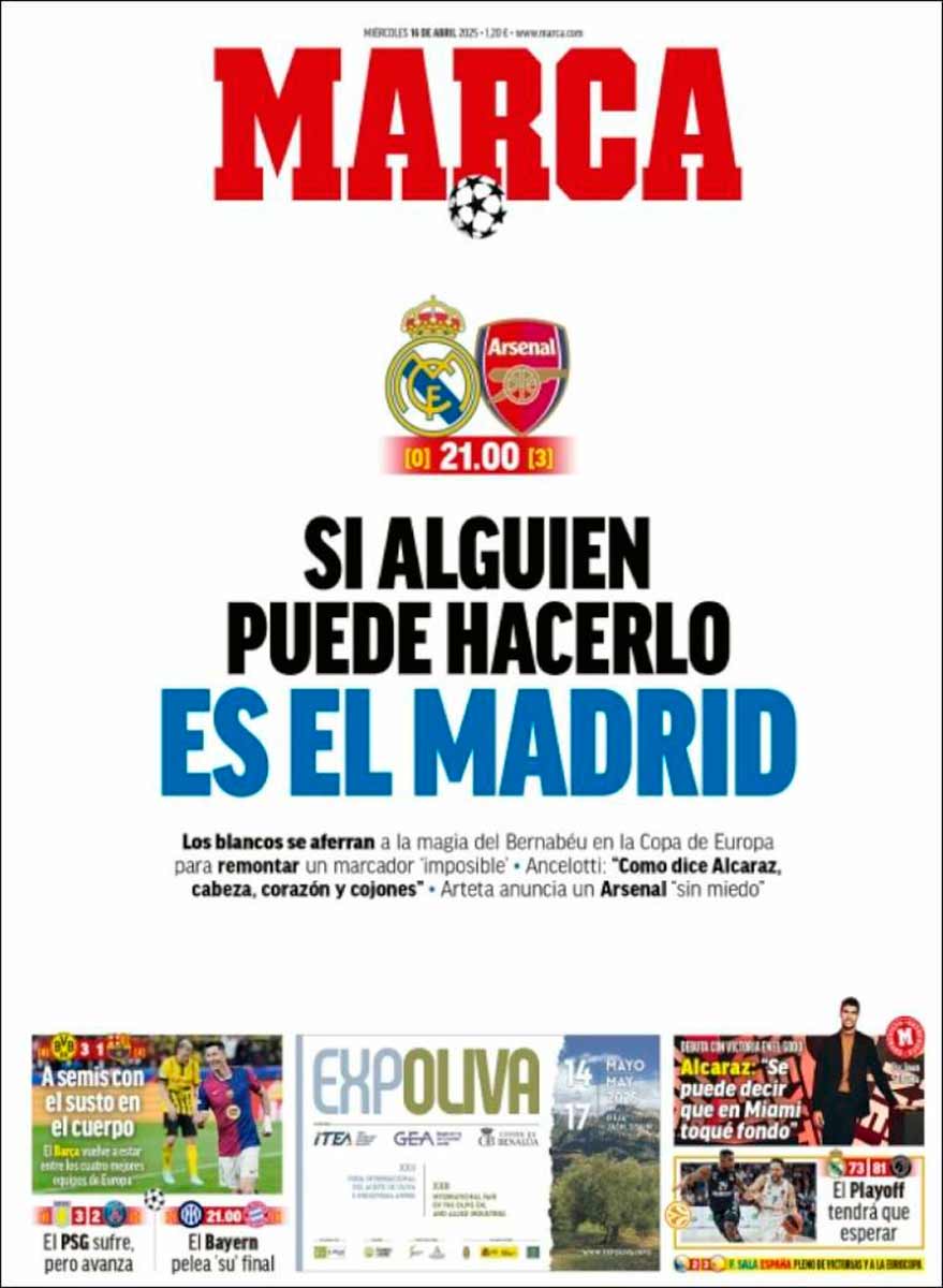 Marca factura una portada minimalista, lo que quizá sea el mejor modo de reflejar lo inefable. “Cabeza, corazón y cojones”, receta Ancelotti, en un eco de Alcaraz. No sabemos si la aplicación del lema ha de ser necesariamente en ese orden. De hecho, es lícito preguntarse lo que la cabeza pinta en la ecuación. No falta quien, como nuestro admirado Antonio Valderrama, aboga por “abrir la puerta del manicomio”. ¿Dónde queda ahí la cabeza? La única cabeza que sería deseable tener esta noche sobre el césped es la de Santillana, nos parece. Mejor que reine la locura, al alimón con los cojones y el corazón.