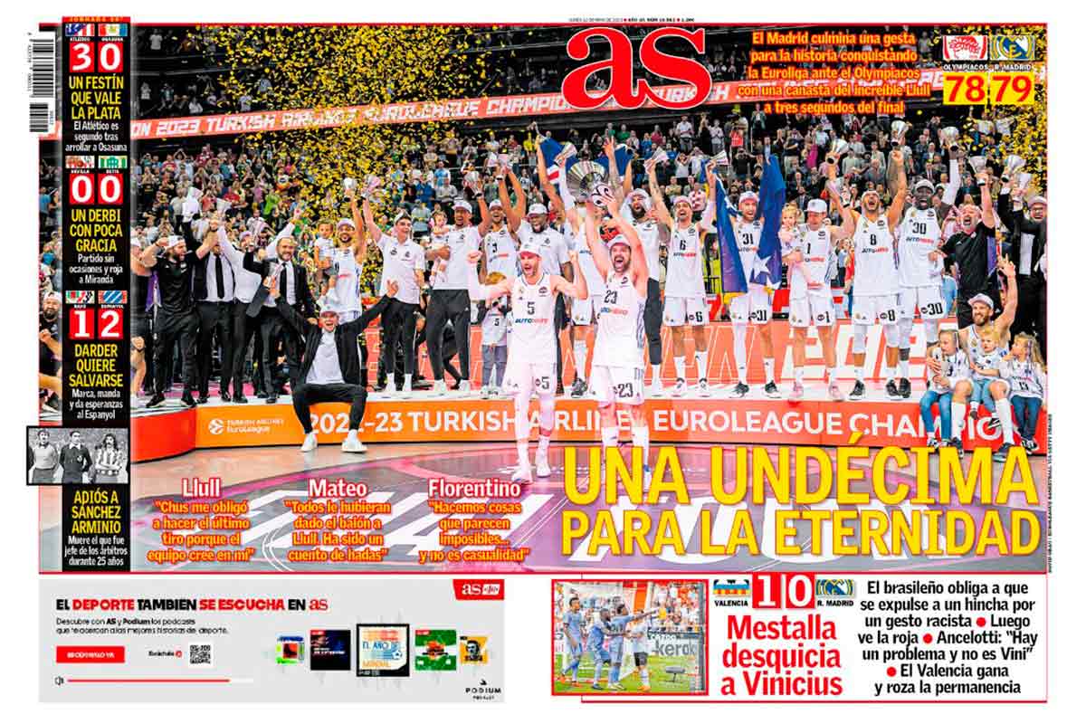 As también otorga la debida importancia al triunfo en Kaunas. Ojalá a partir de ahora As y todos los demás procedan a dar más cancha al baloncesto blanco. Hablan en portada de la canasta salvífica de Llull a falta de tres segundos (¿cuántas de estas lleva?, ¿qué lugar ocupa en la historia del Real Madrid quien ha resuelto tantos partidos cruciales en los últimos estertores?, ¿cuánto hay que querer al primer Premio Forja de la Gloria de La Galerna?), como podían traer a portada el triple no menos decisivo del Chacho muy poco antes, o la omnipresencia tavaresca, o la excelencia de Hezonja, o la efectividad de Randolph, o… o…