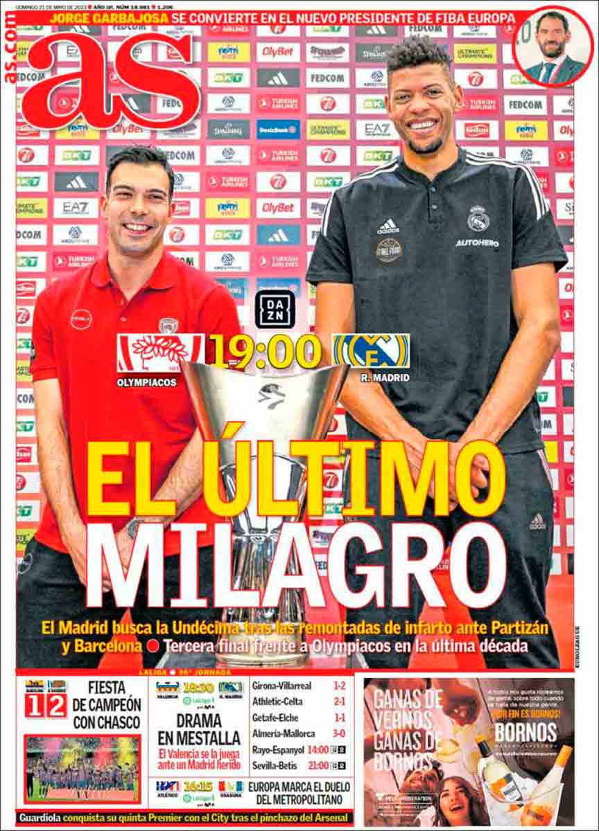 Es cierto que, si acudimos a la prensa deportiva que tiene la mala costumbre de editarse en Madrid, sí aparece como asunto central la disputa esta tarde de la final de Euroliga entre el Real Madrid y el Olympiacos. Pero debe de tratarse de un error, si no de algo peor. Queremos pensar que Marca y As han salido hoy a los quioscos antes de haber recibido la información de suspensión que sí recibió Sportivo a tiempo. No queremos pensar que, aun habiendo recibido dicha información, los medios mesetarios hayan decidido obviarla para así seguir ensanchando la ancestral prepotencia madridista, de la que los citados Pep y Lobo carecen en absoluto, humildes de toda humildat, tan bien mamada por Xavi desde shiquitito, Masía mediante, oremos.