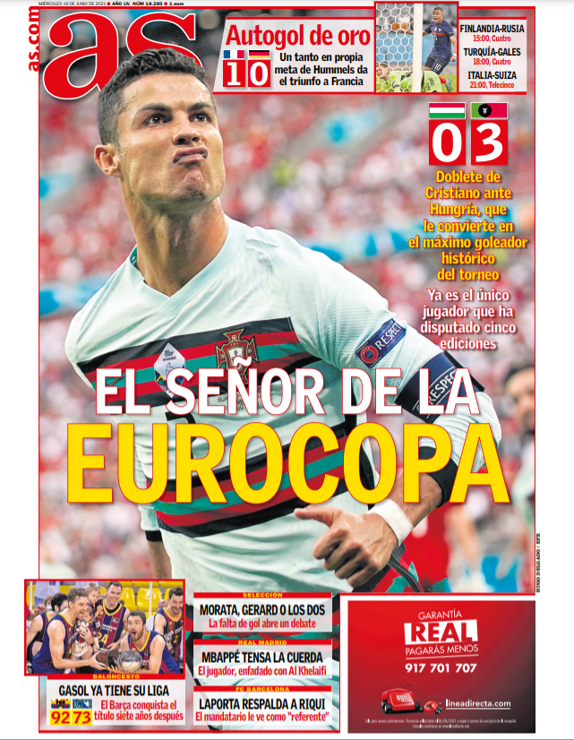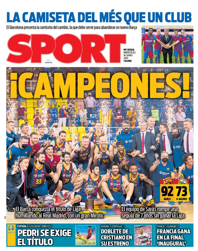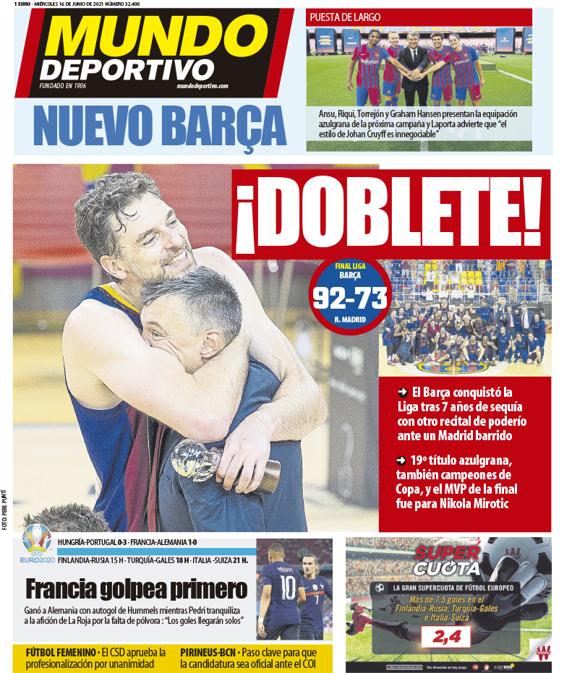 Cómo no van a dar el centro de sus portadas a la victoria en la Liga de baloncesto cuando hace unos días hicieron lo propio con la Champions de balonmano. Menos en balompié, donde se han tenido que conformar con una modesta Copa del Rey, les ha ido razonablemente bien el año, aunque este equipo que según Sport “humilló” al Real Madrid no ha sido capaz de hacerse con la Euroliga pese a su constelación de astros.
