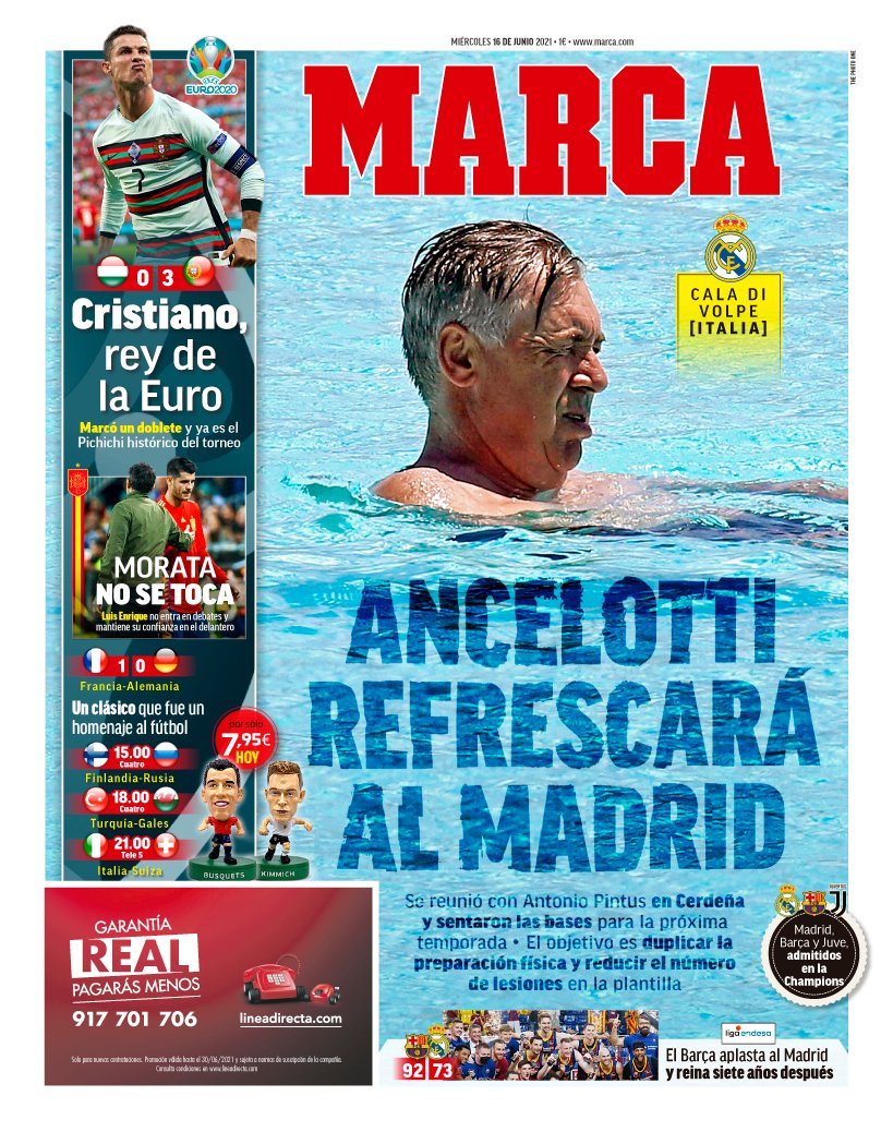 Carletto en remojo y un titular algo traído por los pelos, esa es la portada del Marca de hoy. Parece que Carlo se reunió con Pintus para atajar las lesiones: gran noticia, esperamos (necesitamos) que acertaran en sus diagnósticos y decisiones. También se hace eco Marca de la victoria de Francia ante Alemania (partidazo, con Kylian y Karim en estado de gracia) y del hecho de que la UEFA haya “admitido” a Madrid, Barça y Juve en la Champions.