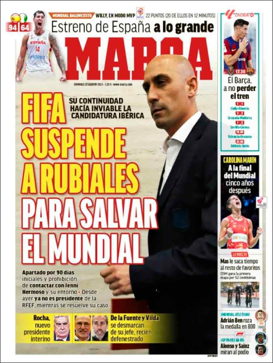Buenos días, amigos. Ha tenido que venir la FIFA a sacar la basura, imaginad el hedor que habría. El máximo organismo mundial del fútbol ha suspendido durante 90 días a Rubiales de la presidencia de la RFEF mientras se resuelve su caso. También le prohíbe contactar con Jennifer Hermoso y su entorno (el de ella), porque Rubiales y su entorno (el de él) ya sabéis que son muy de contactar y presionar cuando algo no les gusta, incluso cuando es la realidad lo que no les gusta. Marca le dedica su portada a esta noticia.