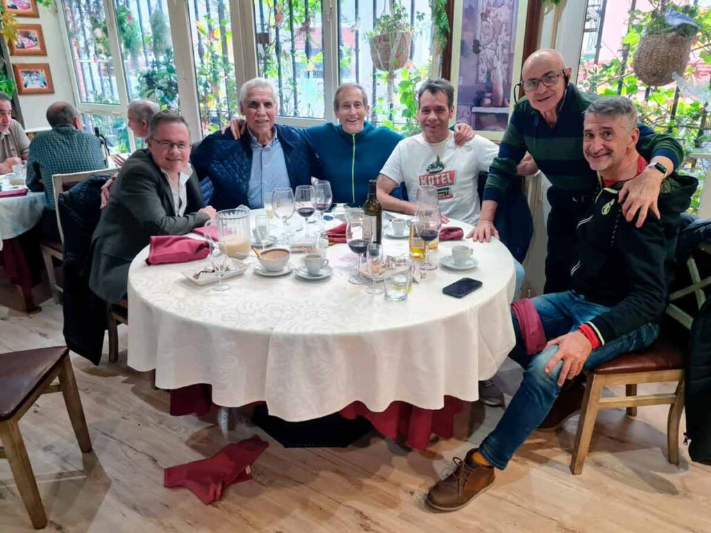 No terminaba ahí la jornada amigo-festiva. Había proyectado una mesa con amigos de los que sabía que les haría mucha ilusión conocer a Walter y compartir la manduca con Vicente Ramos, persona ilustrada y cordial. Rubén Amón nos esperaba y fue el primer sorprendido, gratísimamente. Apasionado por el baloncesto, la llegada de las leyendas le produjo cierto asombro y su rostro contestó con una amplísima sonrisa a lo inesperado. Después llegaron los Jesús, fraternales colegas, Bengoechea y Vega, amantes de la canasta y más blancos que el hombre de Ariel.