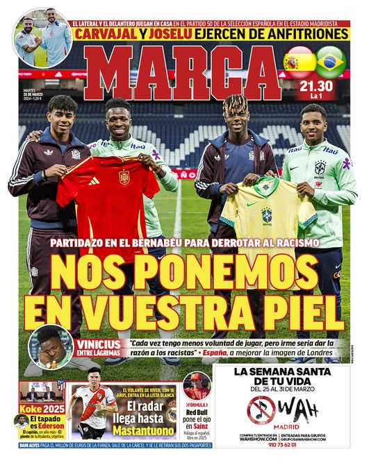 As y Marca prefieren abrir con el partido de esta noche que con las lágrimas de Vini, a las que se da una presencia residual. El choque amistoso de hoy comparte trasfondo porque es contra el racismo, precisamente, pero nos habría parecido mucho más procedente dar las portadas al llanto de Vinicius. Poner el foco en el partido dulcifica el escenario. Lo que copa las portadas del mundo entero hoy no es este amistoso, sino las lágrimas de la joven estrella.