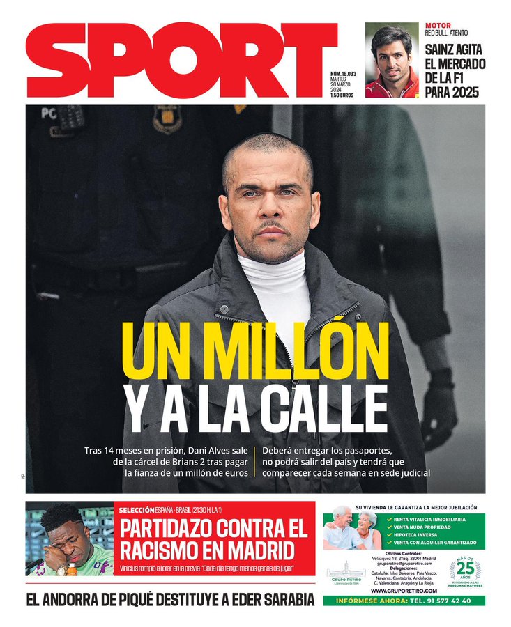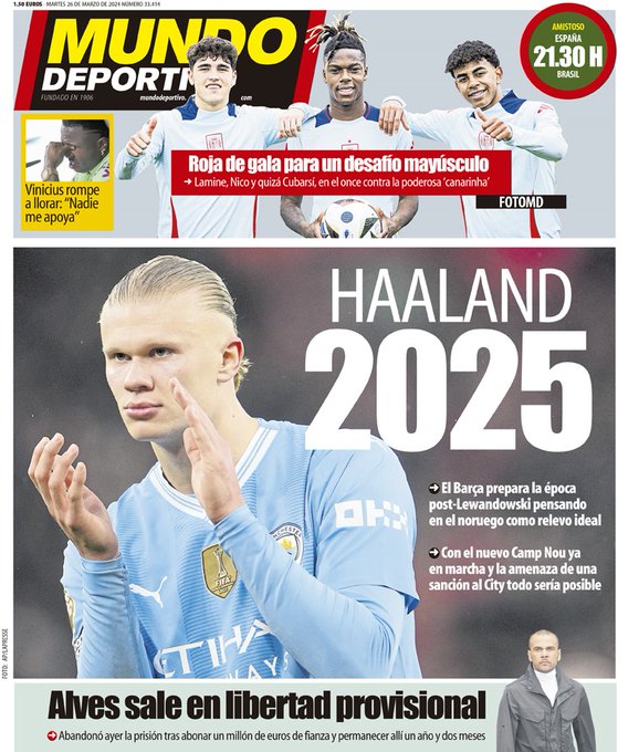 La prensa cataculé, entretanto, pasa bastante del asunto Vini (Mundo Deportico le dedica un miniespacio casi lacónico). No esperábamos menos de ellos. A cambio nos traen la liberacion de su (¿ex?) ídolo Dani Alves y sus ganas de fichar a Haaland en 2025. El que hambre tiene con pan sueña.