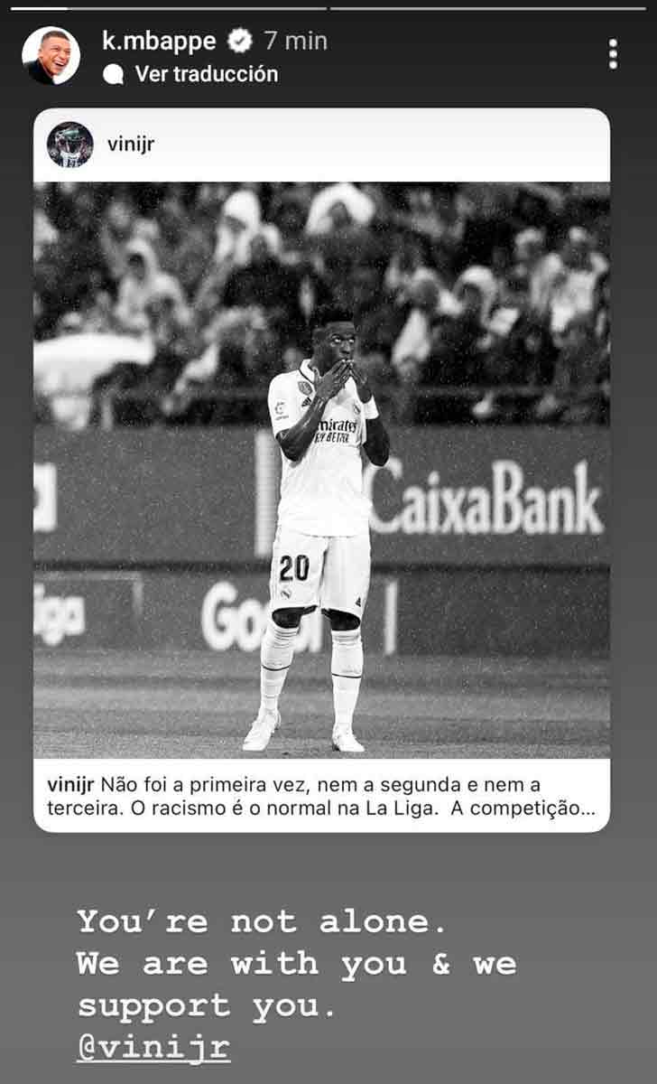 “No estás solo. Estamos contigo y te apoyamos, Vinícius”. Mbappé.