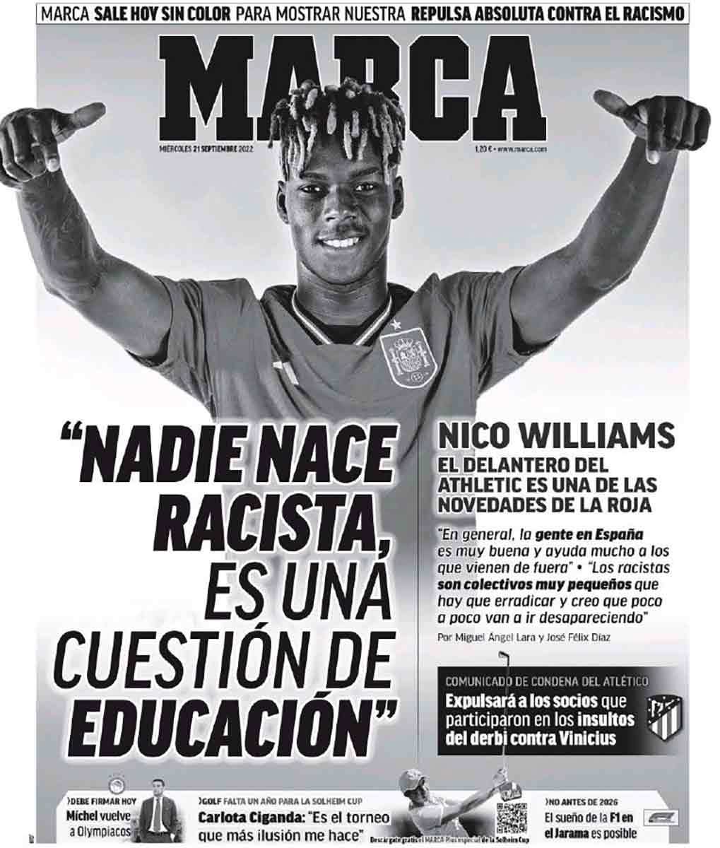 Frases como “No soy racista, pero es que Vinícius…”, “Condeno que le llamen mono, pero él había provocado”, “Se pasan mucho con él, pero tiene que calmarse, se lo busca con su actitud” definen al emisor de las mismas. En España hay muchos racistas que están convencidos de que no lo son. Un ejemplo es —una vez más— Marca.