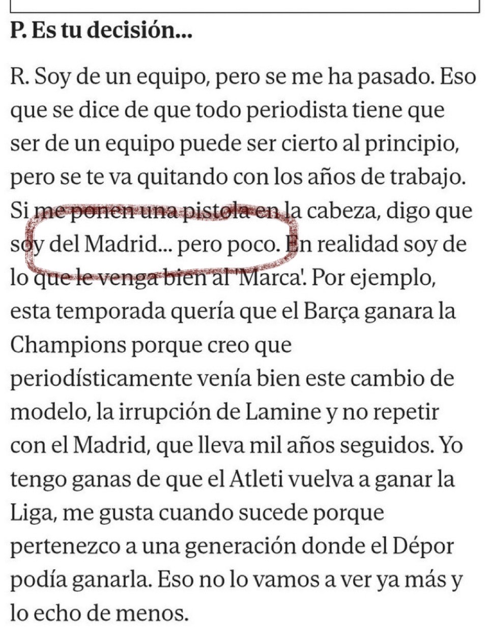 Añade Palomar que en realidad él es “de lo que le venga bien a Marca”, y que a tal efecto deseaba que el club cliente de Negreira ganase este año la Champions, porque le venía bien a su periódico, sin que el hecho de que se trate de una entidad que ha corrompido, corrompe y corromperá para los restos el fútbol español sea óbice, valladar ni cortapisa para ese deseo. Al fin y al cabo, Palomar es madridista, sí.