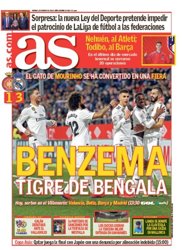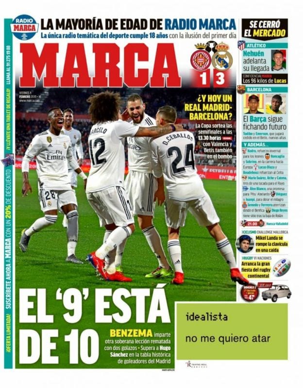 Una buena trompeta -a la salud de Karim- parecen haberse fundido los hacedores de portadas de Ouija Today, que en derroche imaginativo han decidido que convertir al galo en gato -copyright Mourinho- no era suficiente. Gracias a los muchachos de Relaño, relamido hoy también desde su púlpito, Karim es un tigre de bengala. Podría ser de Sumatra. O siberiano. O indochino. Pero no. Es de bengala. ¿Por qué? Porque mola mas para portada.