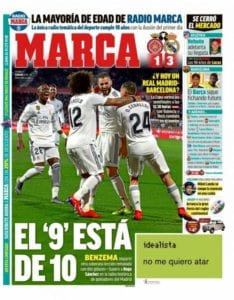 15. Buen y divertido portanálisis, pero al mismo tiempo ácido contra quienes no sienten el madridismo. La Galerna,que yo recuerde, nunca habló mal de Karim, me refiero a su juego. Karim siempre ha sido un futbolista diferente, un delantero atípico, pero con un fútbol de precisión y de equipo.Pone al equipo por delante de todo, es un jugador generoso, y bien que se aprovechó Cristiano.Este año se siente más liberado y, por eso, marca goles. Y que sigan.La prensa catalana, yo ni la miro.¿Para qué?Hala Madrid.