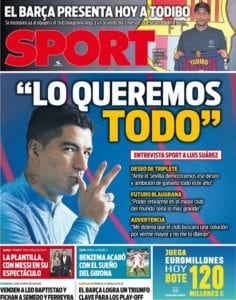 Tanto que relega a los bajos de portada otra entrevista a Luis Suárez ¡otra!  (con idéntico gesto de soplar la flauta de VARtolo, por cierto), que vendría a completar hasta el empacho la oferta periodístico deportiva del culerío.