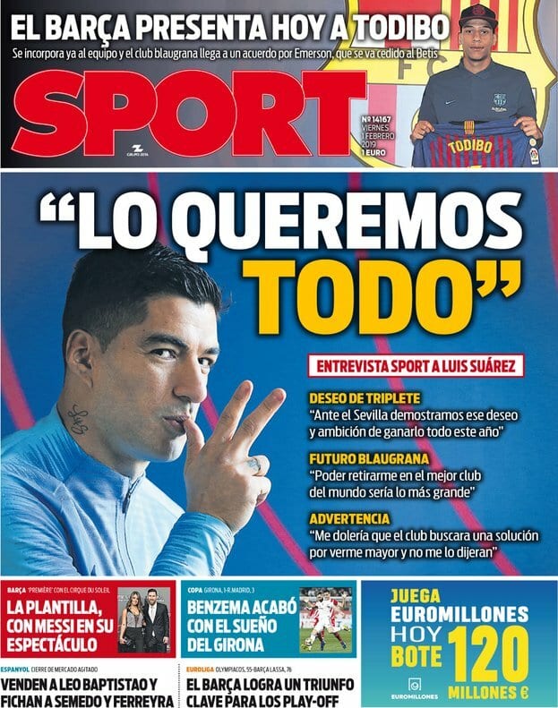 3. Al ver la portada de Sport me ha venido a la cabeza el tuit de Norcoreano del otro día: "Suárez, Boateng y Arturo Vidal lo mismo te triangulan a primer toque que te organizan un alunizaje en un concesionario de Carabanchel".
