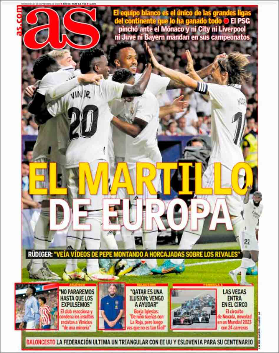 Buenos días. Las portadas de la jornada de hoy no guardan excesiva relevancia, aunque después les hincaremos someramente el diente. La actualidad ha venido marcada en las últimas horas por la denuncia de Iñaki Angulo, que en su canal de YouTube ha acusado a El Chiringuito de amenazar a Vinicius con “destrozarle” editorialmente si publicaba su vídeo de condena del racismo, vídeo este último motivado entre otras cosas por las palabras de Pedro Bravo en el propio programa. Angulo sostiene que tiene pruebas de su acusación, que Pedrerol niega al tiempo que amenaza con querellarse criminalmente contra su oponente.