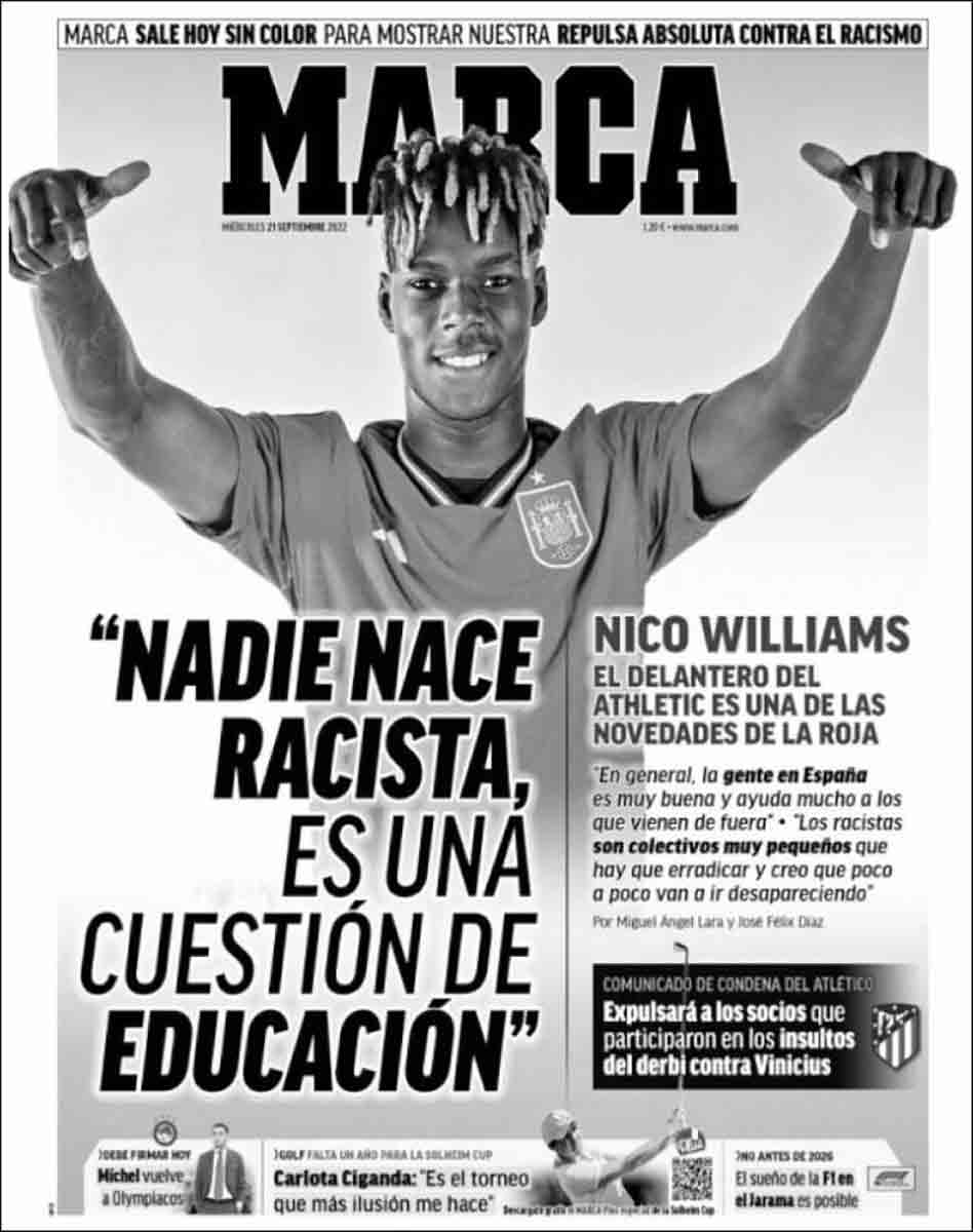 A buenas horas mangas verdes. No se trataba de apoyar hoy miércoles la lucha contra un racismo genérico sobre la figura de Nico Williams. Se trataba de apoyar el domingo pasado la lucha contra el racismo específico del Frente Atlético contra Vinicius, de Pedro Bravo contra Vinicius, y por vía indirecta o de omisión contra otros racismos específicos, desatados todos contra el delantero brasileño.
