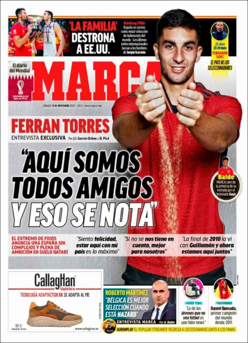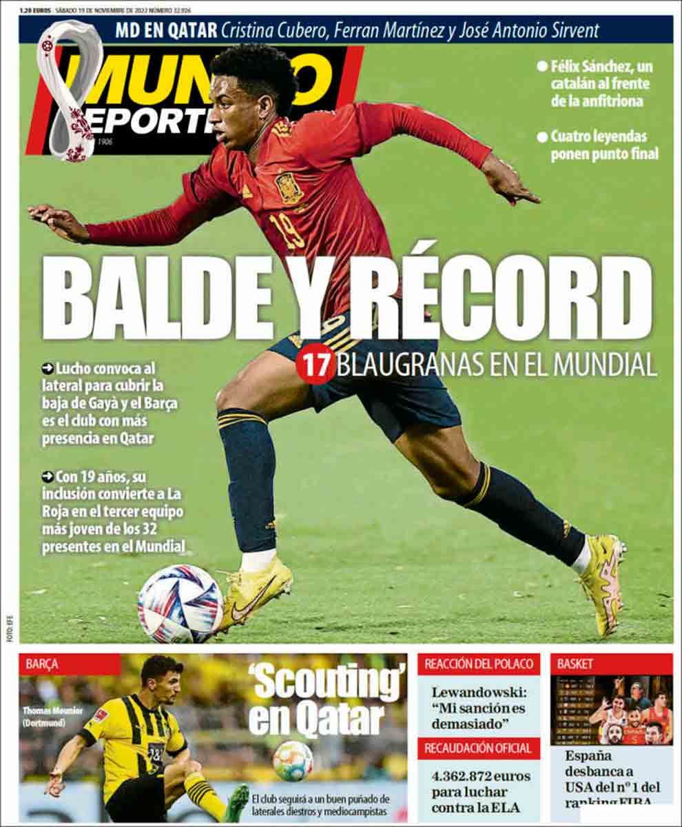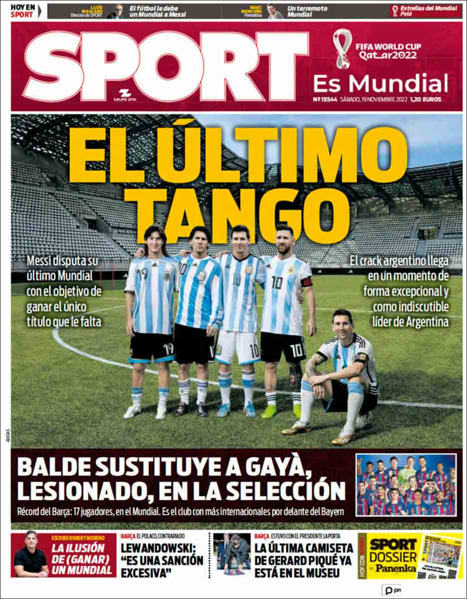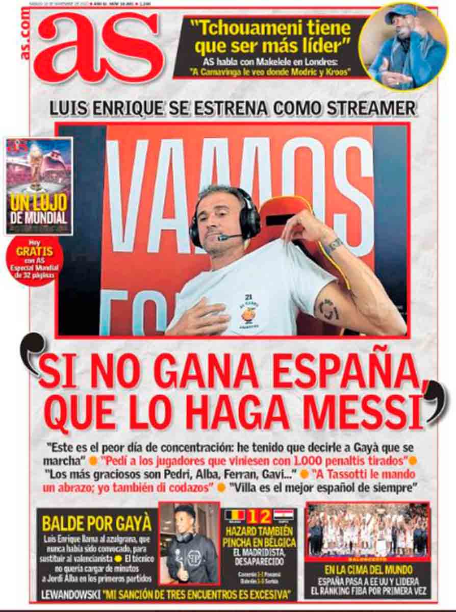 Otra maravilla de portada: Luis Enrique estirándose. ¿Cabe portada más glamurosa en la historia de las portadas? Observen la postura corporal, el gesto sudapollista nivel top, el recado a su antiguo club con el logo de Naranjito, la mascota del Mundial del 8-2, y esas palabras… No las referidas a sus deseos sobre Messi y el mundial (el de Catar irá siempre con minúsculas), sino las que vemos en el párrafo inferior, de las cuales destacamos las siguientes (atentos, amics):