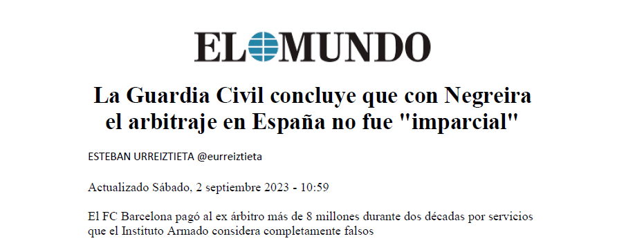 Pero la gran noticia del día la trae El Mundo. La Guardia Civil acorrala al Barça por el negreirato. La Benemérita ha concluido el informe solicitado por el juzgado del Caso Negreira y sus conclusiones son devastadoras para cualquiera que tenga un mínimo de afecto por los colores blaugranas y lleve meses y meses escudándose, de manera intelectualmente cobarde cuando no desvergonzada, en que no había indicios de corrupción arbitral en el hecho de pagar durante 17 años (mínimo) al vicepresidente de los árbitros.