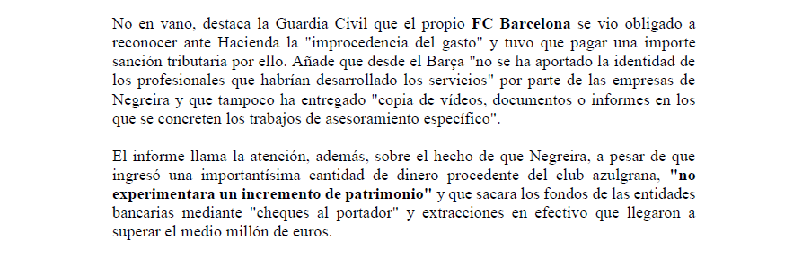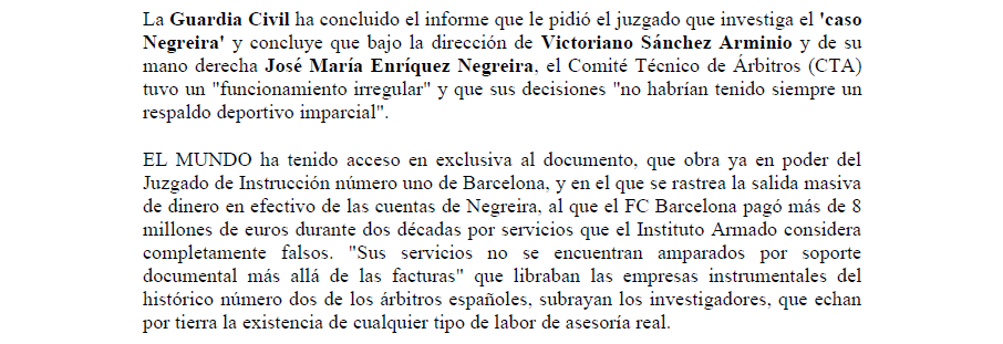 Paciencia. Ya hablamos de este tema cuando muchos decían que no iba a pasar nada. La justicia, por suerte, aún es independiente de los políticos. Cualquiera que haya estudiado derecho sabe que no es necesario demostrar que Negreira pagaba a los árbitros, el mero hecho de intentar influir, incluso aunque no hubiera pasado (que pasó), es delictivo en grado de tentativa. Si yo pago a alguien para que cometa un delito y al final se queda con el dinero, yo tengo responsabilidad penal. Aún así creo que no es el caso. Lógicamente va a depender del criterio del juez pero llama la atención que el informe de la Guardia Civil sean tan contundente. Esperemos a ver que ocurre. Lo que resulta evidente es que el PSOE no va a mover un dedo en este momento. No podemos esperar nada del gobierno salvo trabas en este sentido. El País a esta hora ni siquiera menciona la noticia. El mensaje está claro.