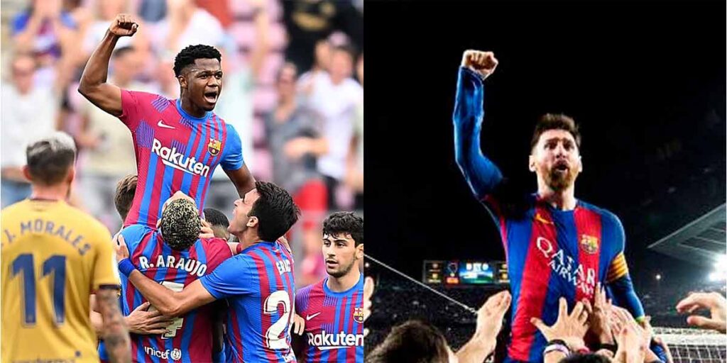 Viendo las fotos de Messi y de Ansu, me viene a la cabeza una idea: EL NUEVO BECERRO DE ORO. Y una segunda: comparando las celebraciones de Barsa y Real Madrid encuentras una diferencia más: en el Barsa una inclinación ante el ídolo ( Oh señor,estamos aquí para servirte!, tu mandas y los demás obedecemos,), o la celebración,en piña, en conjunto, del Real Madrid,engrandeciendo el concepto de equipo.”Es lo que hay”.