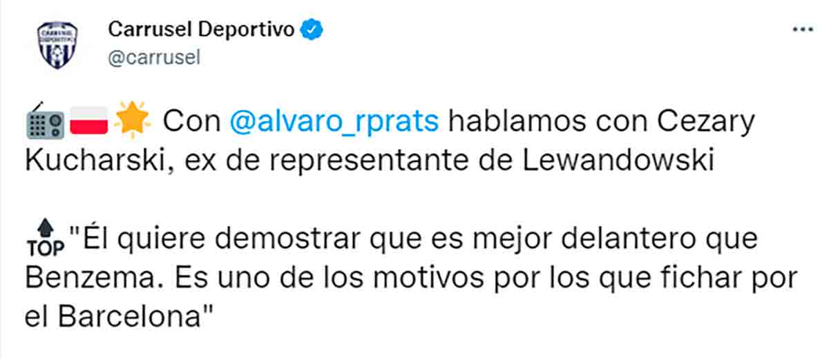 El exagente de Lewandowski nos cuenta que este quiere ser mejor que Benzema y considera que el mejor modo de lograrlo es fichar por el Barça. ¿Cómo hincamos el diente a esto? ¿Vale la pena indicar que Lewandowski nunca será mejor que Benzema, que mucho menos logrará tal propósito fichando por el Barça y que en cualquier caso nada de esto importa mientras venga de las fauces no del agente, no, no, sino del EXAGENTE del polaco?
