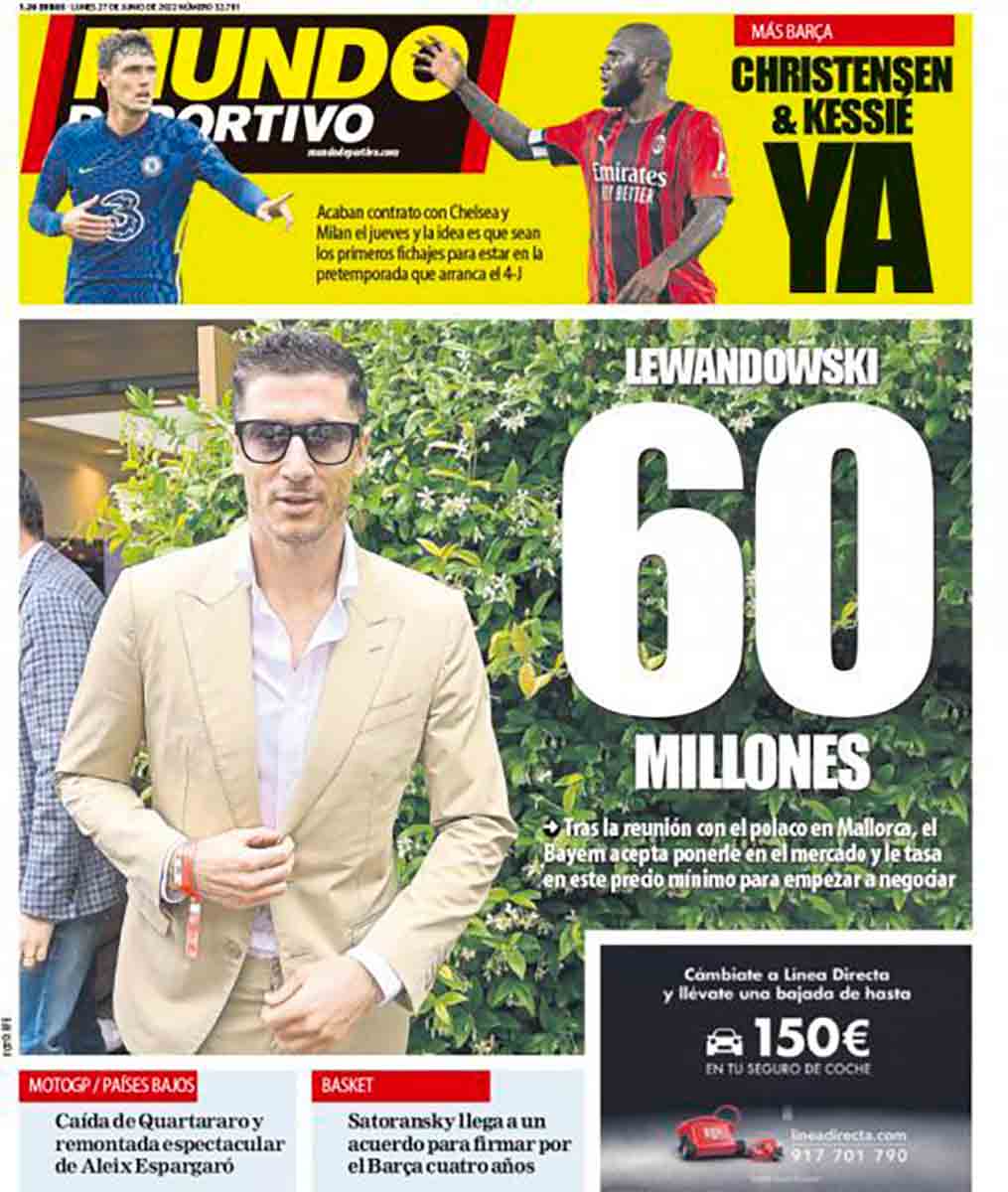 Tenemos a Mundo Deportivo y la enésima portada sobre Lewandowski, con la única diferencia de que el polaco aparece hoy con un atuendo más en consonancia con la estación del año. Parece estar en una boda en Worthing y estar a punto de toparse con Hugh Grant para entablar una conversación que acabe con una embarazoso: “Ya no es mi novia, ahora es mi mujer”. El caso es que Lewan vale 60 millones, de los cuales dispondrá el Barça no bien termine de apalancarse y de pagar los finiquitos de Setién y de Koeman, porque entendemos que pagar a los proveedores será el primer destino de los fondos logrados a través del susodicho apalancamiento, ¿no? Primero pagar a acreedores cuyas cuentas acumulan telarañas y luego fichar a Lewandowski, ¿no?