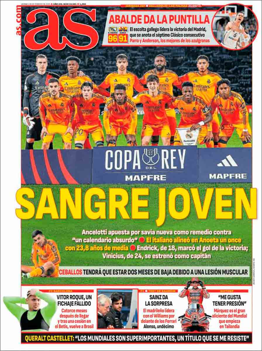 En la parte superior, la portada de As recoge la victoria del Real Madrid sobre el Barça en el mal llamado clásico euroliguero de ayer. Para un equipo, el nuestro, que está lejos de su mejor momento, esta victoria de prestigio supondrá un chute de autoestima. Como bien señala el rotativo en su primera plana, es el séptimo triunfo consecutivo ante el archivillano de la esquinita, y Abalde resultó fundamental para procurarnos la victoria.