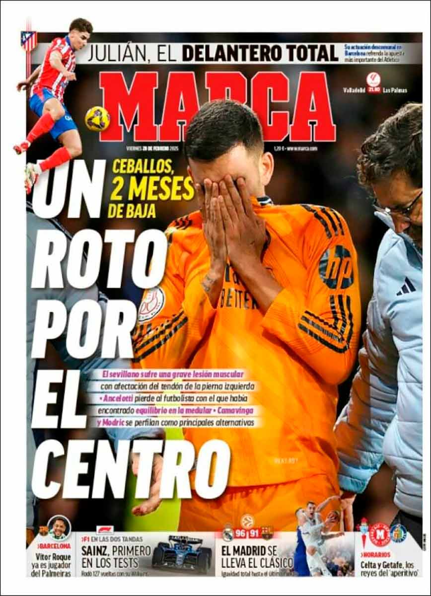 Ancelotti está ya, como es su obligación, en la búsqueda de soluciones. Ese “agujero en el centro” debe llenarse de algún modo. “Camavinga y Modric se perfilan como alternativas”, añade Marca. Pensamos que es la hora de Camavinga. También la de Modric, pero el croata se antoja más bien la solución para la baja por sanción (por fortuna solo dos partidos, uno en liga y otro en Champions) de Jude Bellingham. Ambos podrían jugar frente el Betis y la ida contra el Atleti en la competición continental.