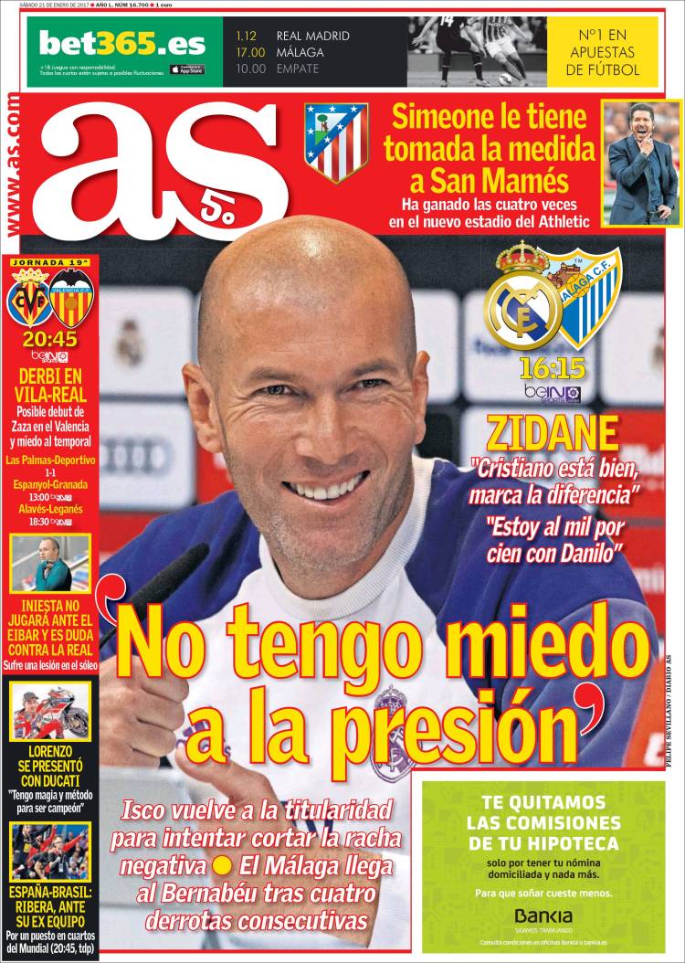 Pero dejemos los milagros y los discursos elevados. Hoy juega el Madrid y la sonrisa de Zidane renueva confianzas desde la portada de As, la misma portada que, en declaración de intenciones poco disimilada, nos cuenta que “Isco vuelve a la titularidad para intentar cortar la racha negativa”. Hombre, Relaño, muy bien por la vuelta de Isco (¿se había ido?), pero ya nos disculparás si no ponemos sobre los hombros del malagueño toda la responsabilidad de cortar esa racha, así como tampoco todo el mérito en el caso de que la racha en efecto se corte, ni todo el demérito en el caso de que (no va a pasar) esa mala racha continúe. El Madrid tiene la suerte de jugar con 11, y creemos que ninguno de ellos es cojo o manco, pese a que algunos, bastantes, no hayan nacido en Málaga, ni siquiera en Andalucía y, para más inri, tampoco en España. Qué ocurrencias tiene la gente, ¿eh? Hay quienes van y nacen en otros países, reduciendo por puro capricho sus posibilidades de ser ensalzados sin fisuras por cierta prensa deportiva patria, más patria que nunca cuando se trata de Isco, o tal vez, más interesada que nunca en detectar y ensanchar la grieta por la que se pueda atacar al entrenador del Real Madrid, sea este quien sea.