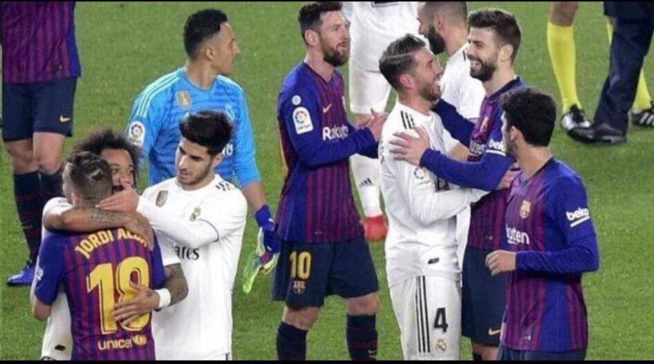 Algo que particularmente irrita es el bochornoso espectáculo al que asistimos los seguidores madridistas, todos destrozados tras dos derrotas seguidas en casa en tres días ante el Barcelona, mientras vemos que nuestros jugadores se abrazan y demuestran una tremenda complicidad con sus rivales, delante de las cámaras. Entiéndaseme: a mí me da igual que Ramos y Piqué sean socios de una empresa, o que unos sean amigos íntimos de otros (como Luis Enrique lo es de Michel o Guardiola de Raúl, por no hablar del presente). Pero en unos momentos tan delicados y de bajón absoluto para los aficionados, tras haber quedado fuera de dos competiciones en 72 horas, en el Bernabéu y ante el adversario más feroz, alguien, un Saporta que no existe hoy en día, debería haber aleccionado a los jugadores para enseñarles que esas actitudes se hagan si se quiere en privado y a puerta cerrada -como si se besan y abrazan toda la noche- pero nunca delante de las cámaras, nunca sonriendo ni tapándose la boca para que no se descifren los chascarrillos que están compartiendo.