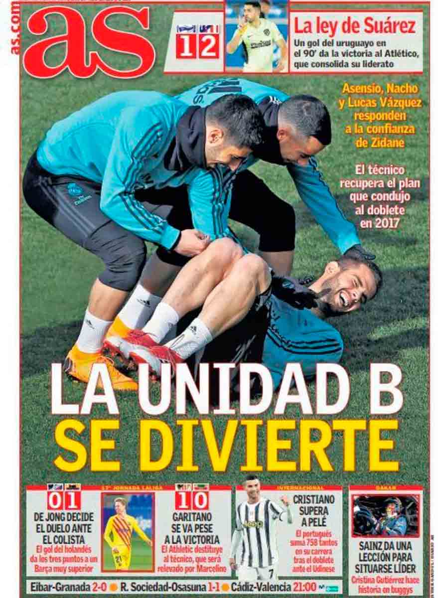 Todo es felicidad y espíritu navideño en As, como podéis ver en su juguetona primera plana. No nos parece mal, dado que están por llegar los Reyes Magos, pero mejor aún nos resultaría que alguien mencionara algo con relación a la permanente licencia para matar de la que goza cierto 007 que le da al mate en lugar de al vodka martini, “sacudido, no revuelto”. Sacudido es como quedó Pacheco y como quedan tantos otros, pero esto no interesa a nadie. A As, hoy, solo le interesa el jolgorio de la presunta unidad B. No tenemos ni idea, por cierto, de por qué As llama “unidad B” a tipos como Lucas Vázquez o Asensio, que parecen contar como titularísimos para Zidane en este momento. Cosas de As.