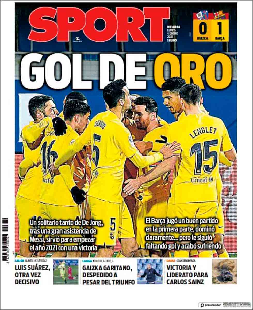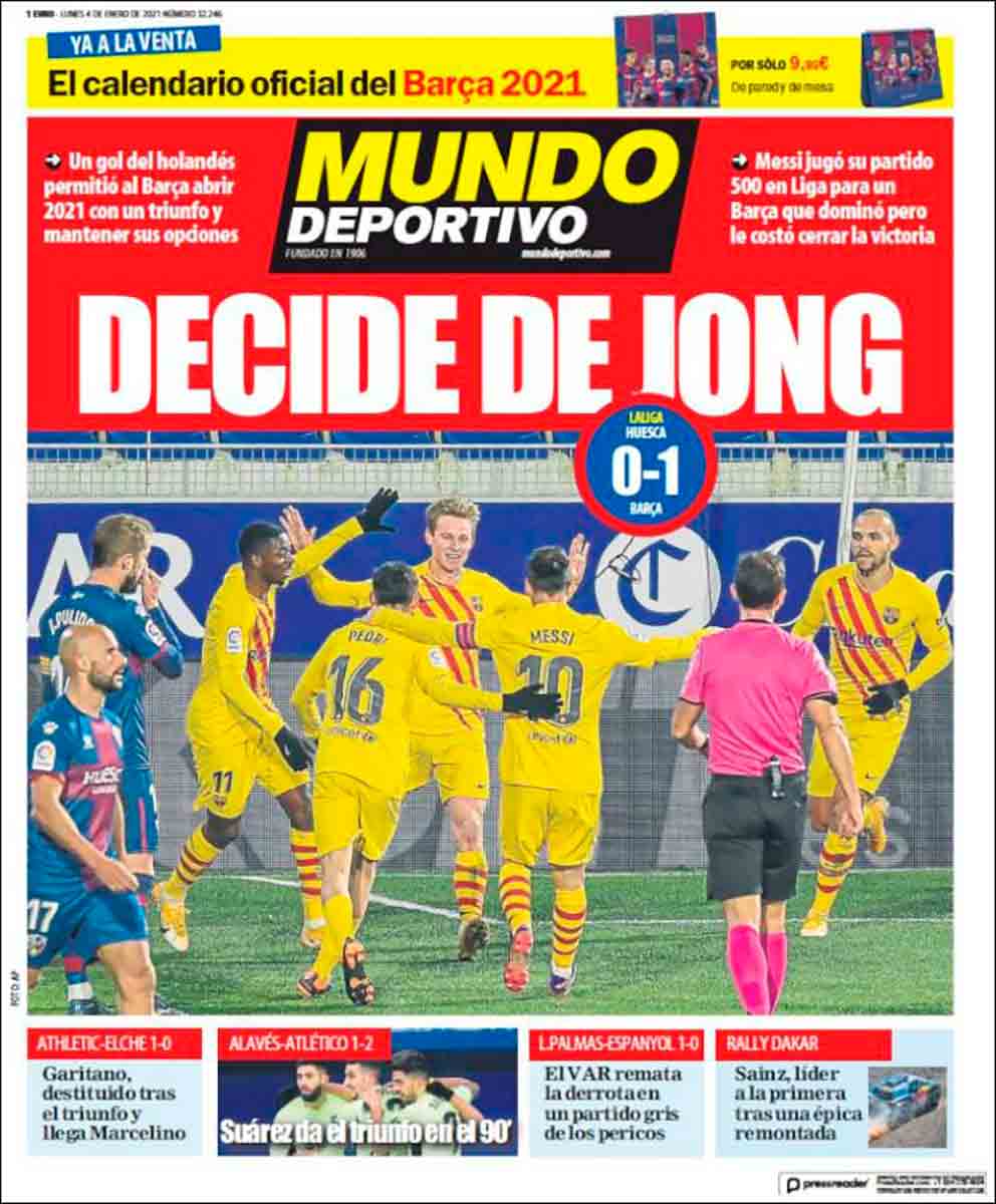 Es enternecedor, por lo demás, el afán por divisar brotes verdes por parte de la prensa cataculé tras la pírrica victoria ante el maltrecho Huesca de los hombres de Koeman. “Un gol de De Jong permite al Barça abrir 2021 con una victoria y mantener sus opciones”, dice Mundo Deportivo. No estamos seguros de que el hecho de que el Barça mantenga las opciones que tiene en este momento sea una buena noticia en clave culé.
