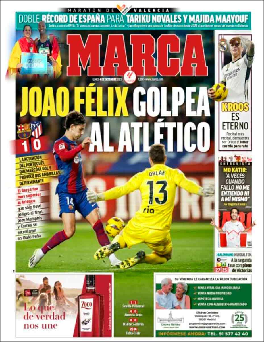 Marca señala la clara superioridad culé sobre un Atleti inoperante, pero no añade la mínima sal a la herida, a pesar de que el autor del gol es un cedido por los colchoneros a su rival. En su primera plana, los de Gallardo tienen el detalle de dedicar un espacio a Kroos, que quizá esté en el mejor momento de su brillantísima carrera. Qué descomunal futbolista.